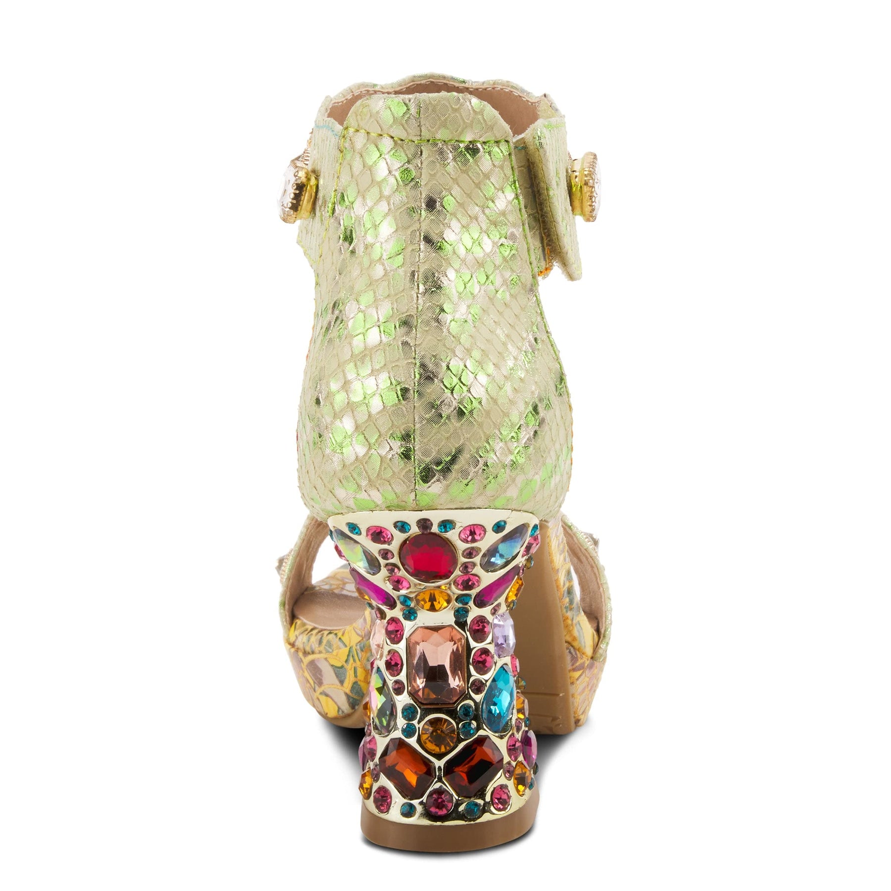 L'Artiste Style: JEWELL Dazzling ankle strap sandal featuring crystal embellished straps and a unique architectural heel with incorporated multi color jewels. Upper: Leather Lining: Synthetic Insole: Synthetic Outsole: Rubber Closure: Hook&Loop Heel Height: 3 1/2" Platform Height: 1" Features: - Adjustable, Padded Insole, Premium Disclaimer: L’Artiste products are made with natural tanned leather using traditional hand painting techniques. This unique finishing process is used to create a natural effect with color variations to deliver authentic look and beauty.