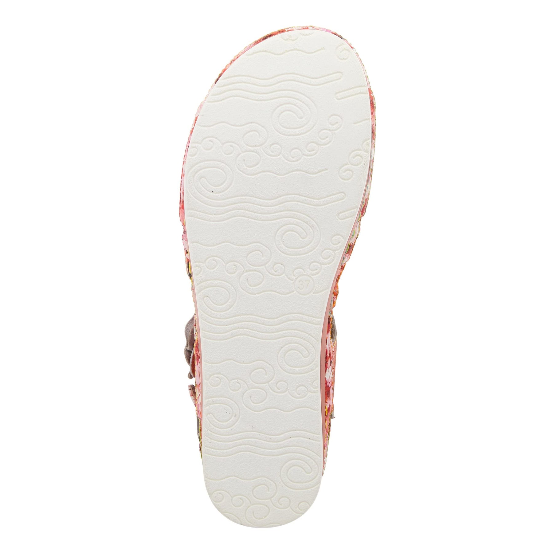 L'Artiste Style: JOELINA-DAZI French inspired design, hand painted leather sandal with triple adjustability. Featuring unique color blocking, two rose buds and our signature rainbow stitching. This is