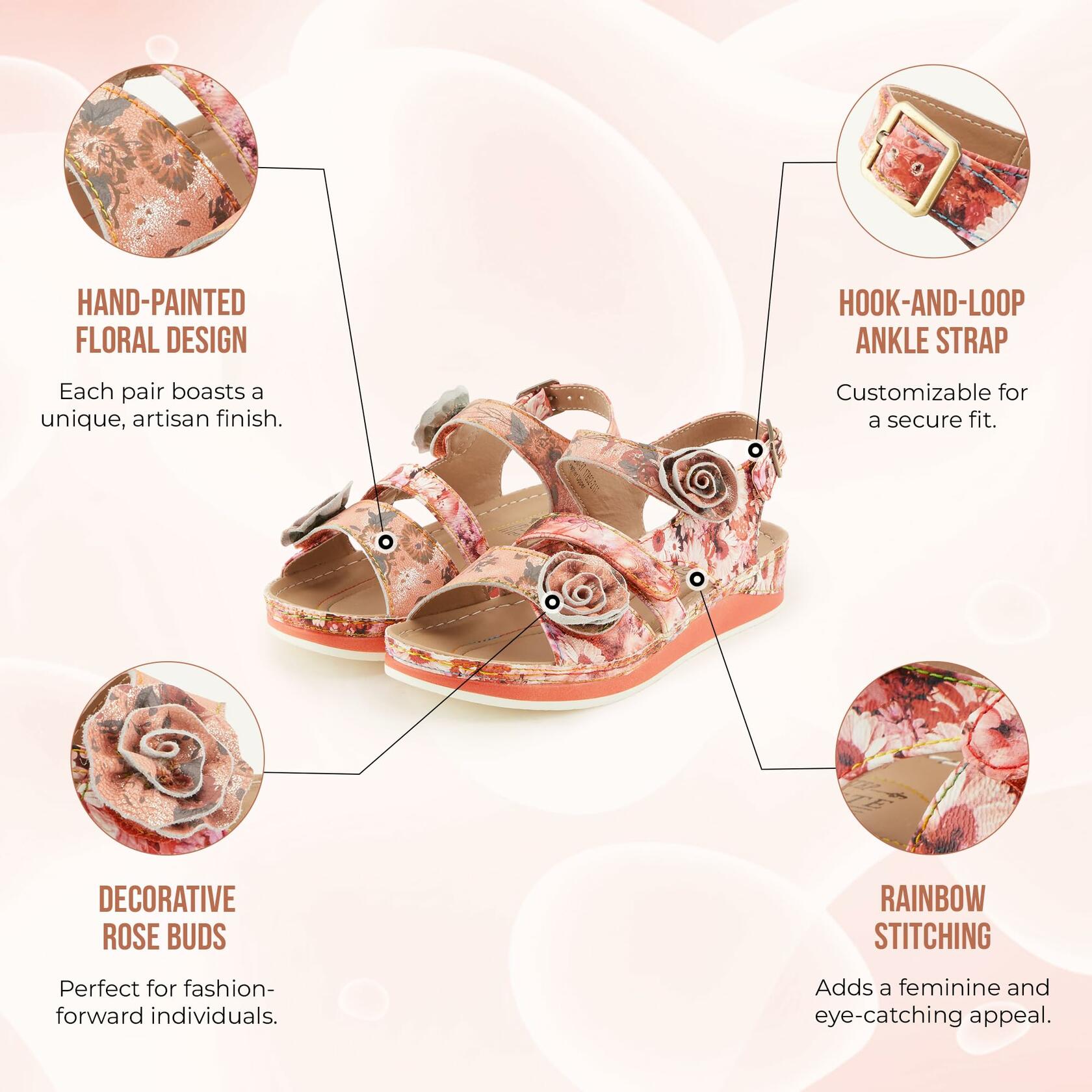 L'Artiste Style: JOELINA-DAZI French inspired design, hand painted leather sandal with triple adjustability. Featuring unique color blocking, two rose buds and our signature rainbow stitching. This is