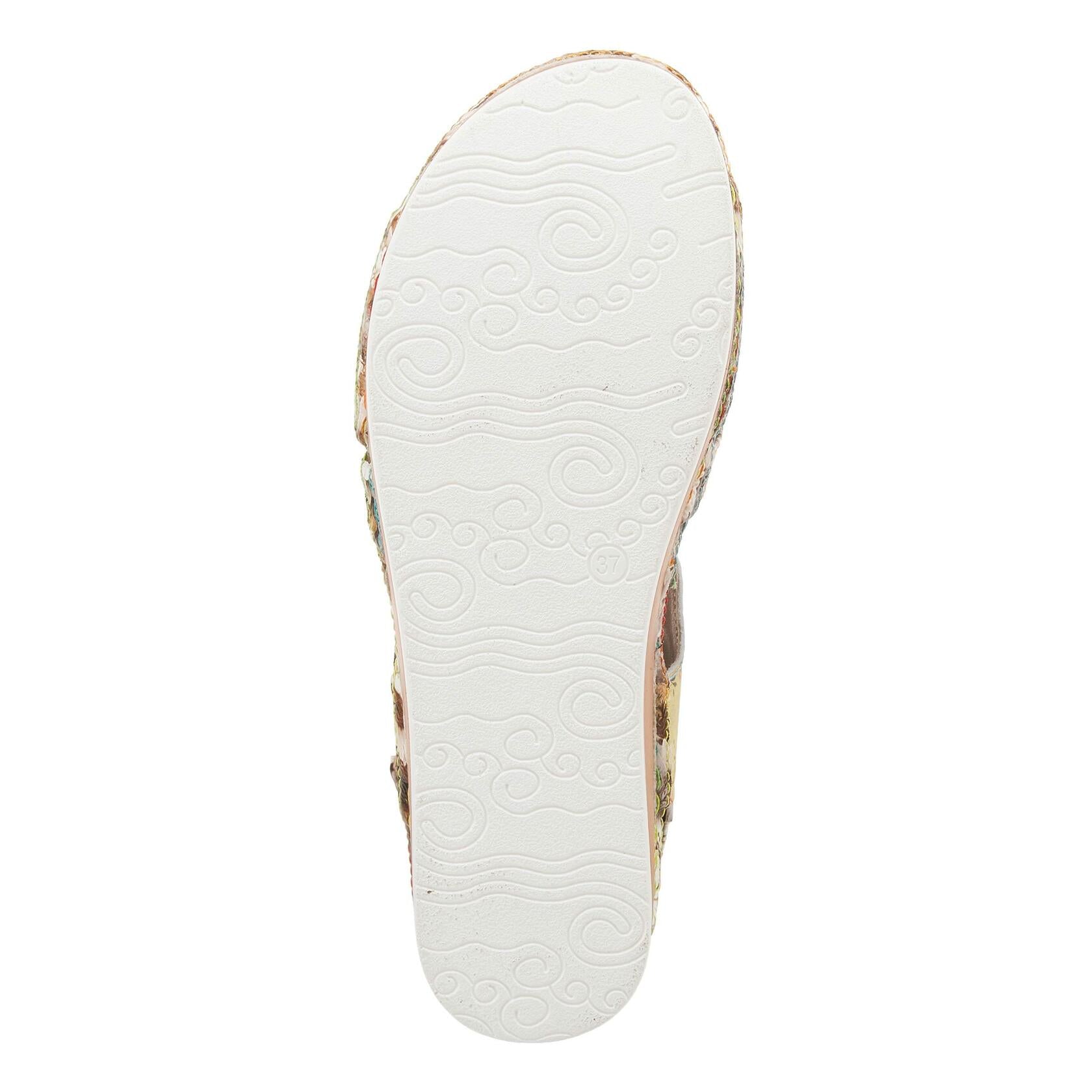 L'Artiste Style: JOELINA-DAZI French inspired design, hand painted leather sandal with triple adjustability. Featuring unique color blocking, two rose buds and our signature rainbow stitching. This is one of our most loved constructions. Upper: Leather and Synthetic Combo Lining: Synthetic Insole: Synthetic Outsole: Polyurethane Closure: Buckle, Hook&Loop Heel Height: 1 1/2" Platform Height: 3/4" Features: - Comfort, Flexible Sole, Hand-painted, Padded Insole, Premium Disclaimer: L'Artiste products are made with natural tanned leather using traditional hand painting techniques. This unique finishing process is used to create a natural effect with color variations to deliver authentic look and beauty.