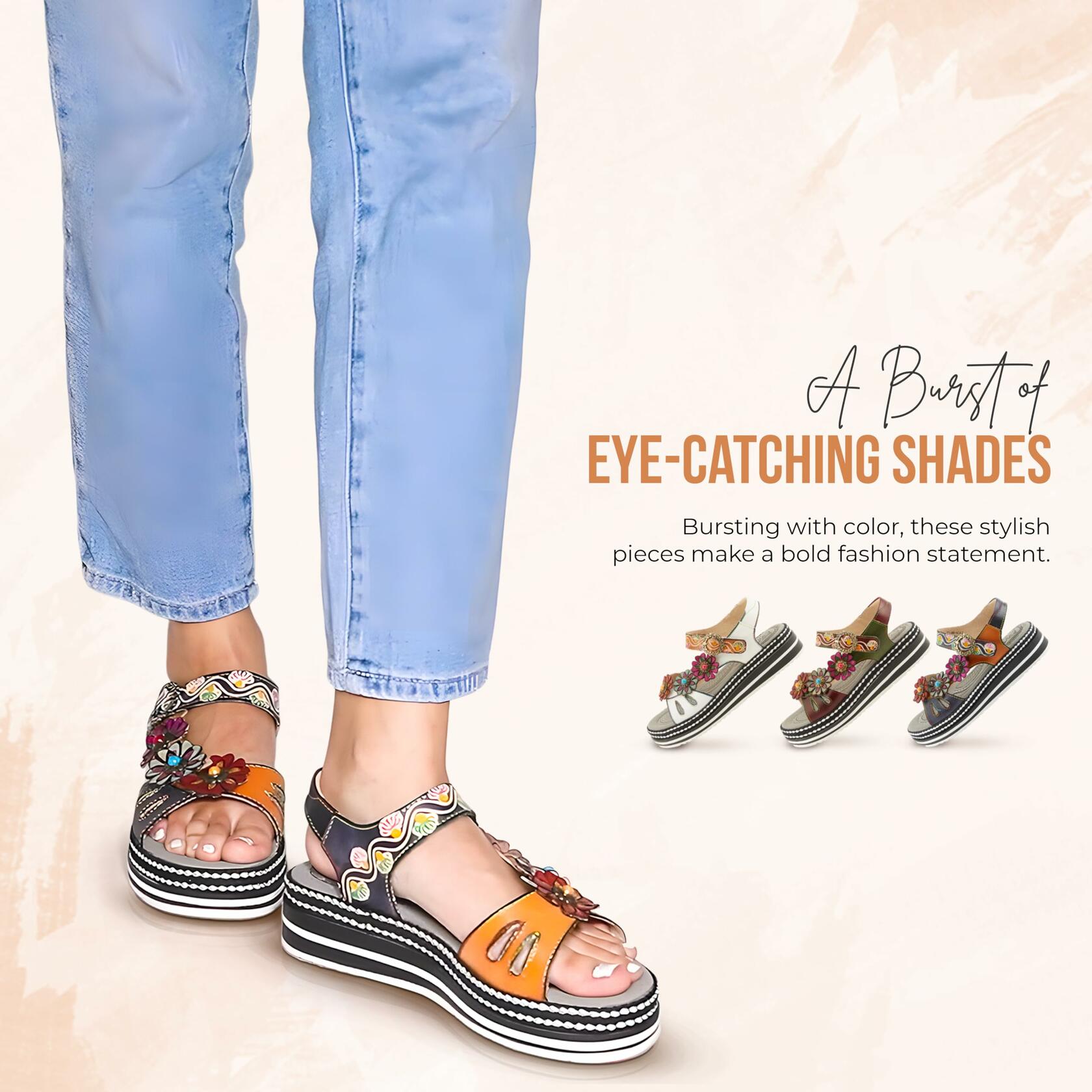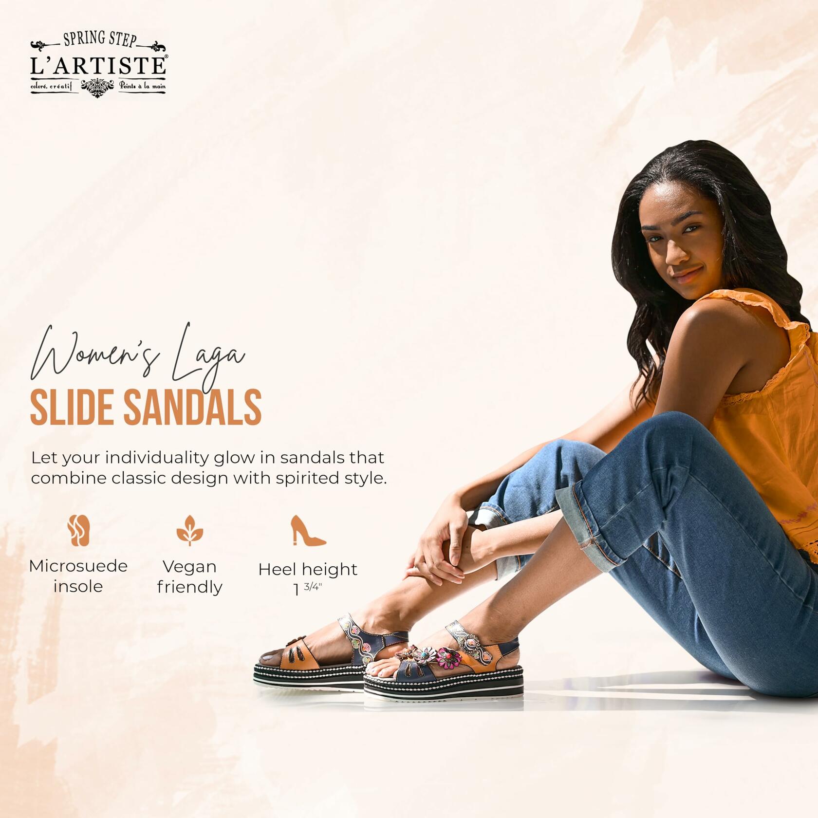 L'Artiste Style: LAGA Super cushiony arch supported footbed with padded back strap and a trio of fun sexy leather asymmetrical center gemmed flowers up the front. Teardrop front cutouts, hand painted wavy hook&loop strap and a circular chain embellished buckle. Upper: Leather Lining: Synthetic Insole: Microsuede Outsole: Polyurethane Closure: Hook&Loop Heel Height: 1 3/4" Platform Height: 1 1/4" Features: - Anatomic Insole, Arch Support, Comfort, Flexible Sole, Footbed, Hand-painted, Padded Insole, Premium Disclaimer: L'Artiste products are made with natural tanned leather using traditional hand painting techniques. This unique finishing process is used to create a natural effect with color variations to deliver authentic look and beauty.