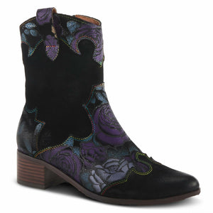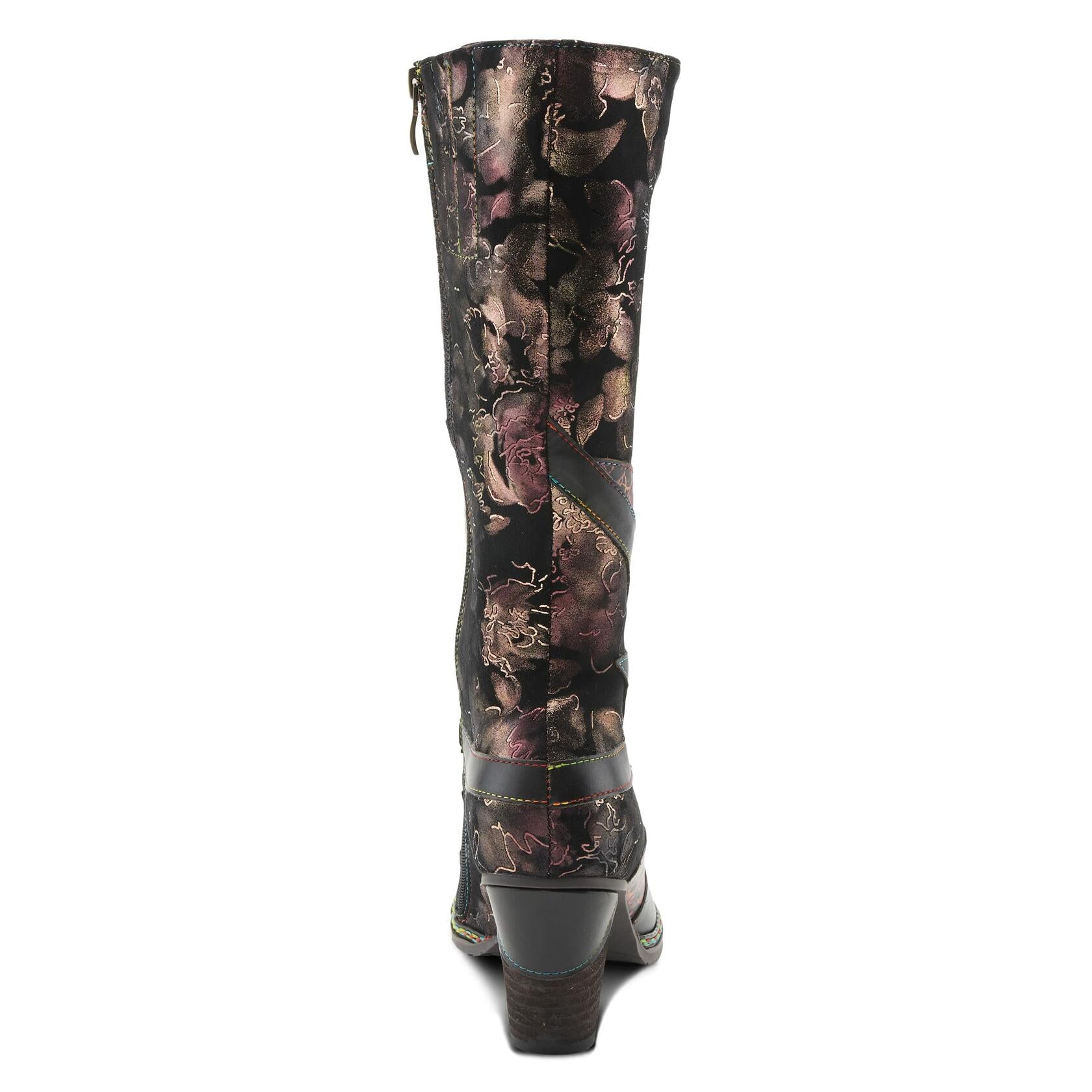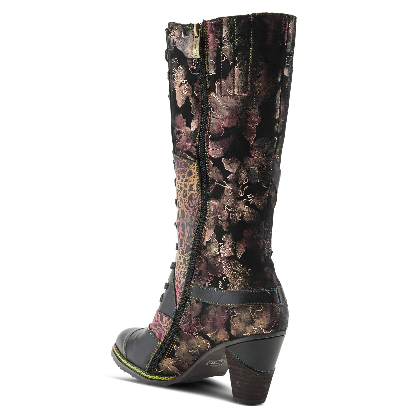 L`Artiste Style: Malagie-Croco Hand-painted leather lace-up boot beautifully patterned with printed floral textile. Upper: Leather and Synthetic Combo Lining: Faux Fur, Synthetic Insole: Faux Fur Outsole: Rubber Closure: Lace-up, Zipper Heel Height: 2 1/2" Platform Height: 1/4" Shaft Height: 14 " Circumference: 14 " Features: - Adjustable, Hand-painted, Padded Insole, Premium Disclaimer: L'Artiste products are made with natural tanned leather using traditional hand painting techniques. This unique finishing process is used to create a natural effect with color variations to deliver authentic look and beauty.