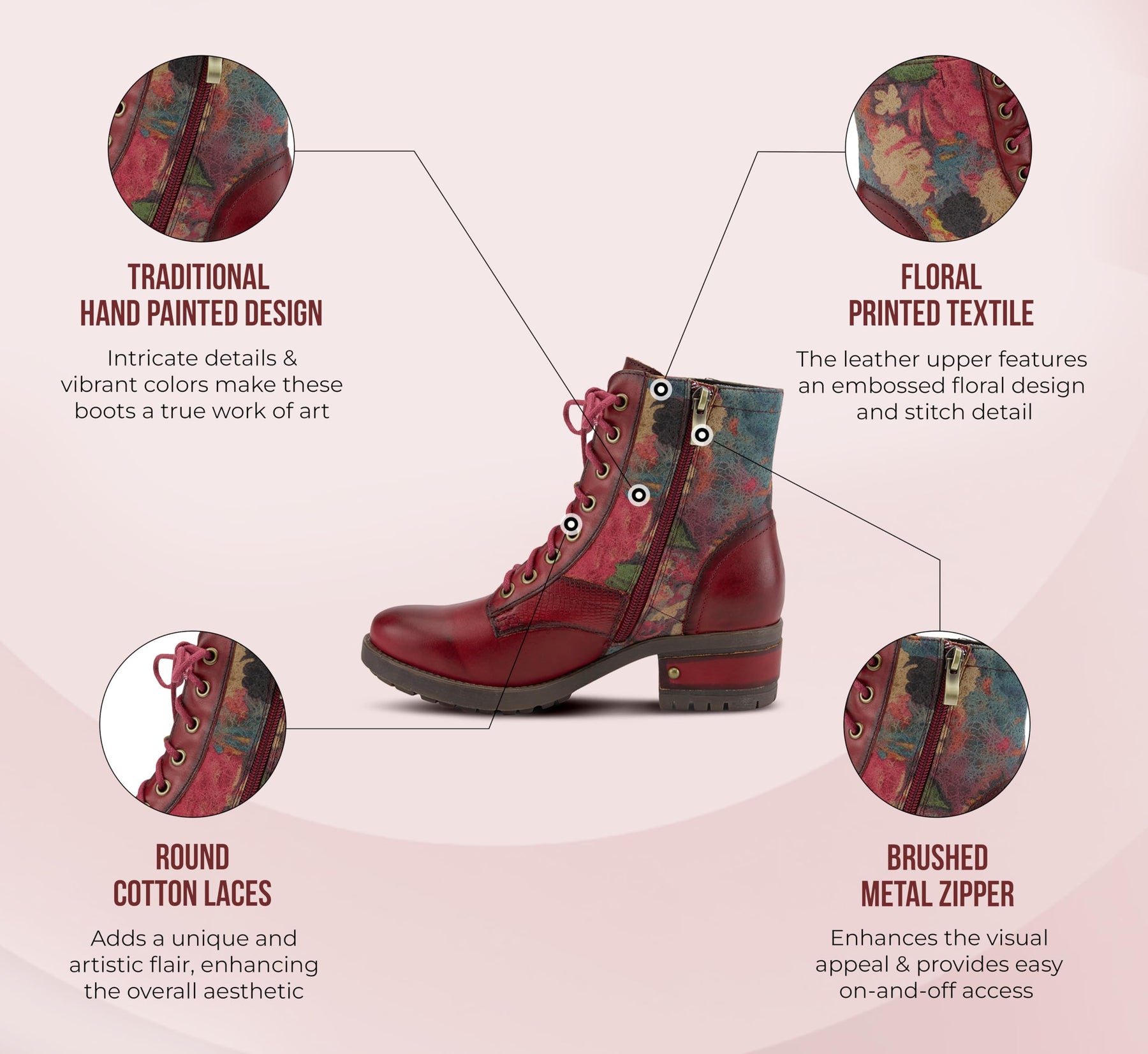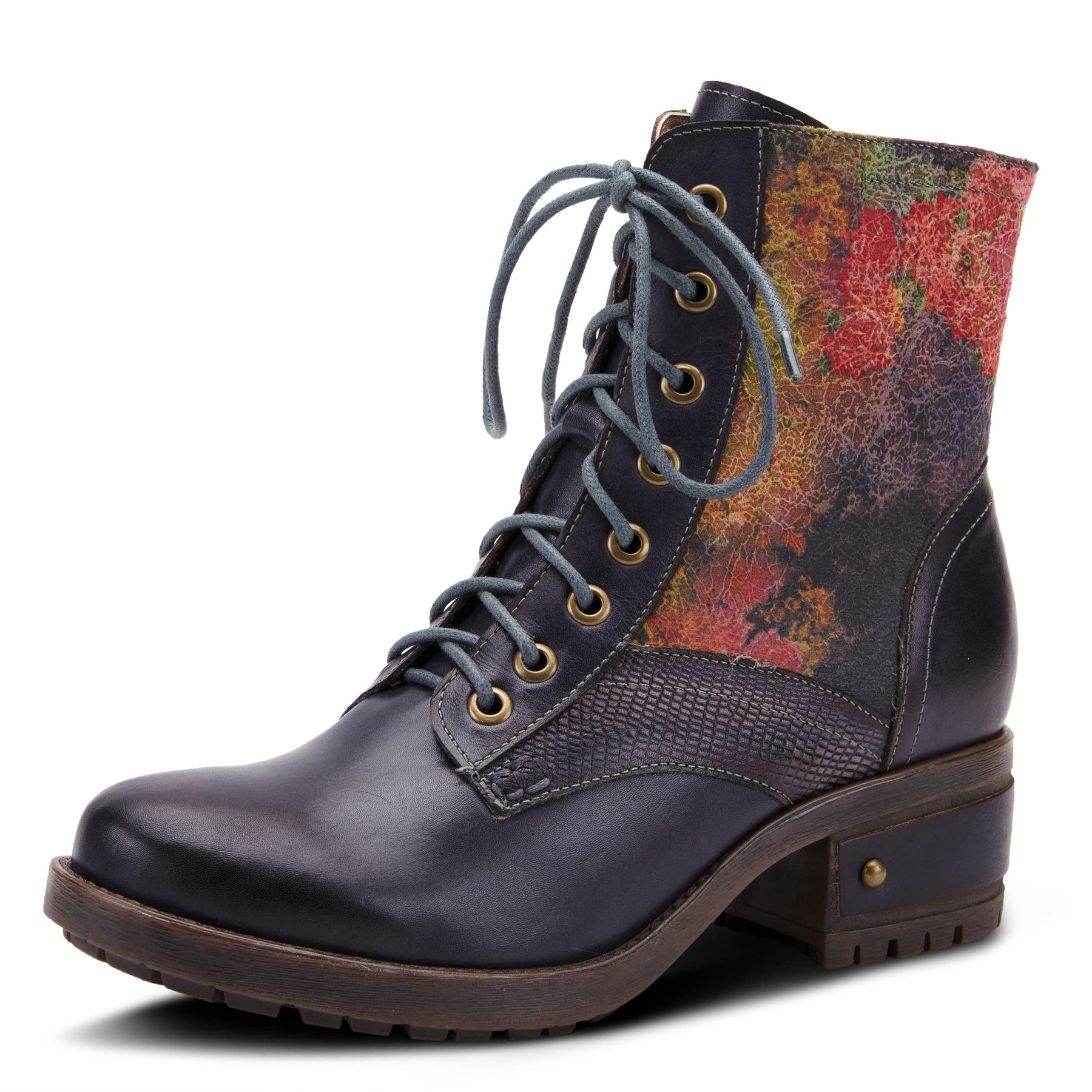 The leaves are starting to turn, your latte is full of flavor, your Marty L'Artiste by Spring Step are comfortable and bright. Combat boots in a floral-printed leather and woven textile upper. Eye catching chevron and striping pattern. Side zipper and front lace closure for optimal fit. Soft flannel lining. Lightly padded flannel insole. Block heel with lug rubber outsole.
