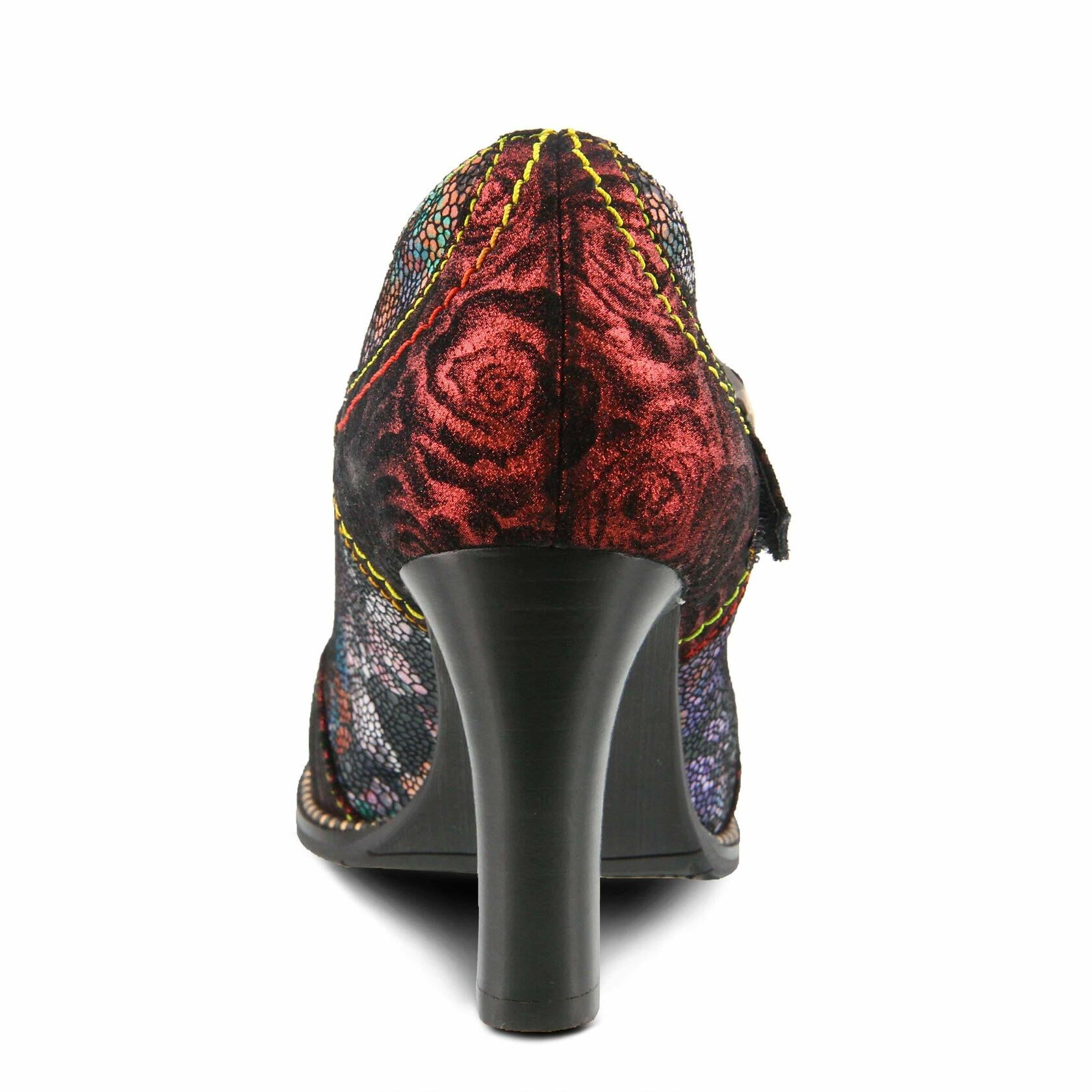 LArtiste Style: Mazie Beautiful closed toe T-Bar shoe, in a combination of two tone textured floral metallic printed leather and a subtle but colorful mosaic patterned shiny leather, a hooks and loops fastening strap with a decorative brushed metal buckle, all on an elegant stacked heel, and bracelet inspired welt design. Heel Height (approximately): 3 Platform Features: - A combination of two tone textured floral metallic printed leather and a subtle but colorful mosaic patterned shiny leather. -Classic almond style toe silhouette. - A fine T-Bar strap design with hooks and loops fastening and a decorative bushed metal buckle. -Imitation leather lining. -Imitation leather, comfortable padded footbed -Sophisticated architectural elegant heel design. -Rubber outsole with beautiful shiny bracelet inspired welt design. -Imported Disclaimer: LArtiste products are made with natural tanned leather using traditional hand painting techniques. This unique finishing process is used to create a natural effect with color variations to deliver authentic look and beauty.