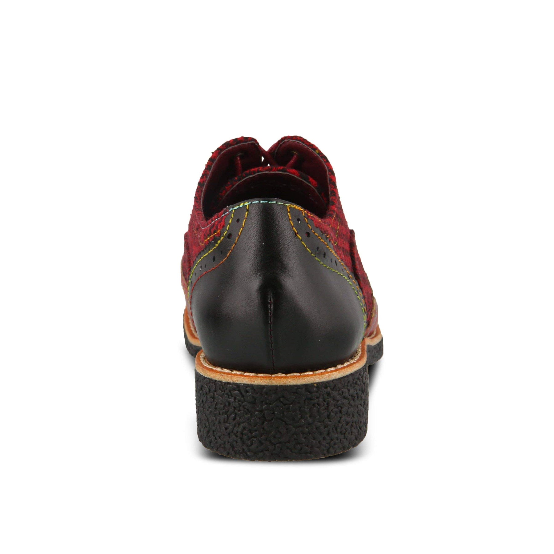 L'Artiste Style: Muggiasti Traditional style four eyelet oxford brogue, with a wax cotton lace, using beautiful two tone plaid wool textile blend with two color burnished and polished leathers, on a rubber crepe textured sole with a heavy natural stitched welt. Heel Height (approximately): 1" Platform Features: - Beautiful upper with two tone plaid wool textiles blend with two colors burnished and polished leathers -Classic almond style toe silhouette -Traditional oxford style brogue design with rainbow upper stitching and four antique eyelets with fine wax cotton lace - Imitation leather lining -Imitation leather padded insole -Heavy natural stitched welt -Rubber outsole -Imported Disclaimer: LArtiste products are made with natural tanned leather using traditional hand painting techniques. This unique finishing process is used to create a natural effect with color variations to deliver authentic look and beauty.