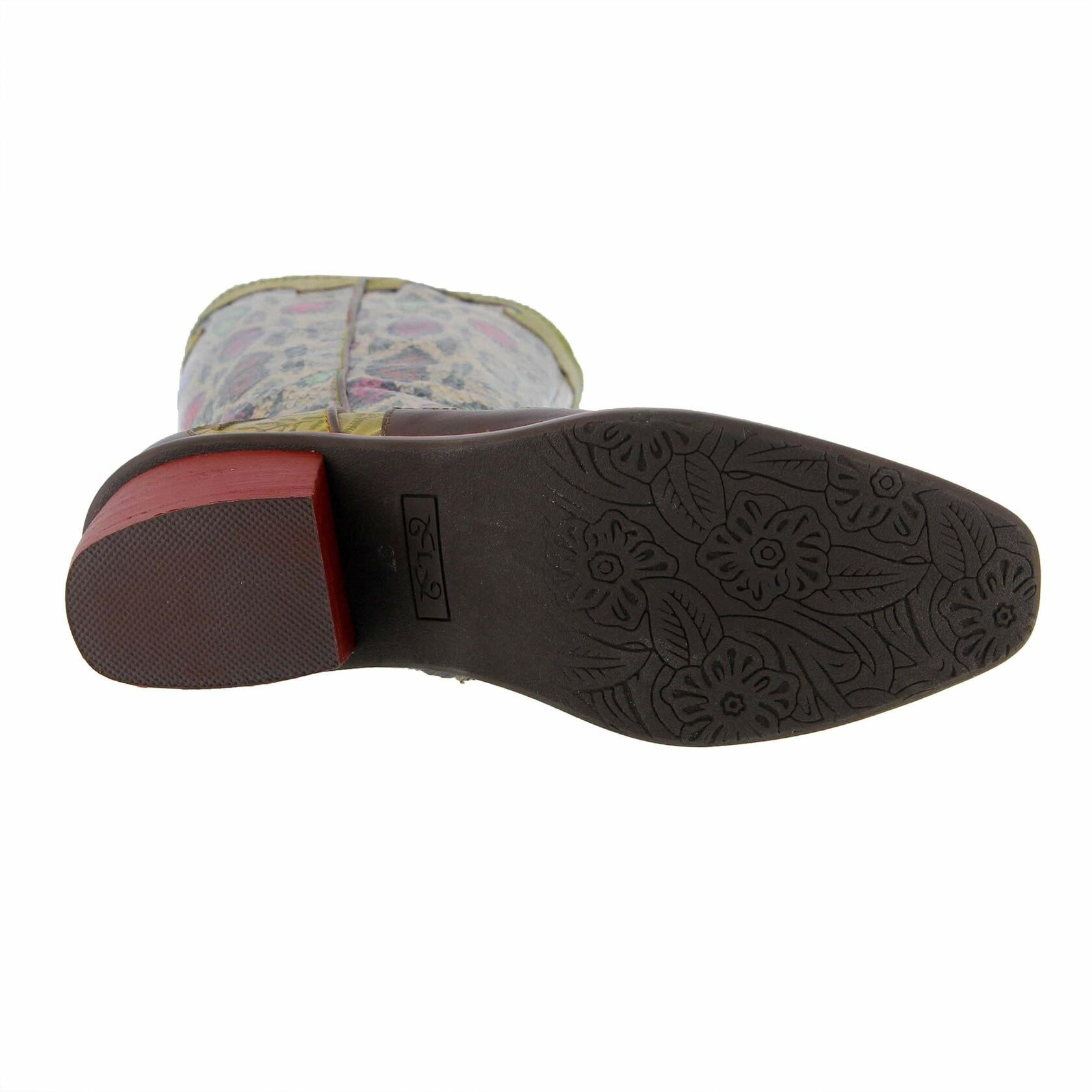 L'Artiste Style: Rodeo Marvelous western style boot using a wonderful combination of soft full grain burnished, polished leather with a complimentary two toned floral printed leather, and multi colored snake printed imitation leather shaft on this exquisite fashionable undercut block heel with full stitched welt. Heel Height (approximately): 2" Platform Height (approximately): 1/4" Shaft Height (approximately): 12 3/4" Circumference (approximately): 14" Features: -Soft full grain burnished and polished unique western style leather wing cap and combined with complimentary floral two toned leather vamp and reptile multi-color printed imitation leather shaft -Classic western style narrow pointed toe silhouette -Full length inside zipper with a brushed metal zipper pull -Soft and cozy textile and imitation leather lining -Imitation leather comfort padded insole -Uniquely curved style stacked and painted heel -Rubber outsole and heavy stitched welt -Imported Disclaimer: L'Artiste products are made with natural tanned leather using traditional hand painting techniques. This unique finishing process is used to create a natural effect with color variations to deliver authentic look and beauty.