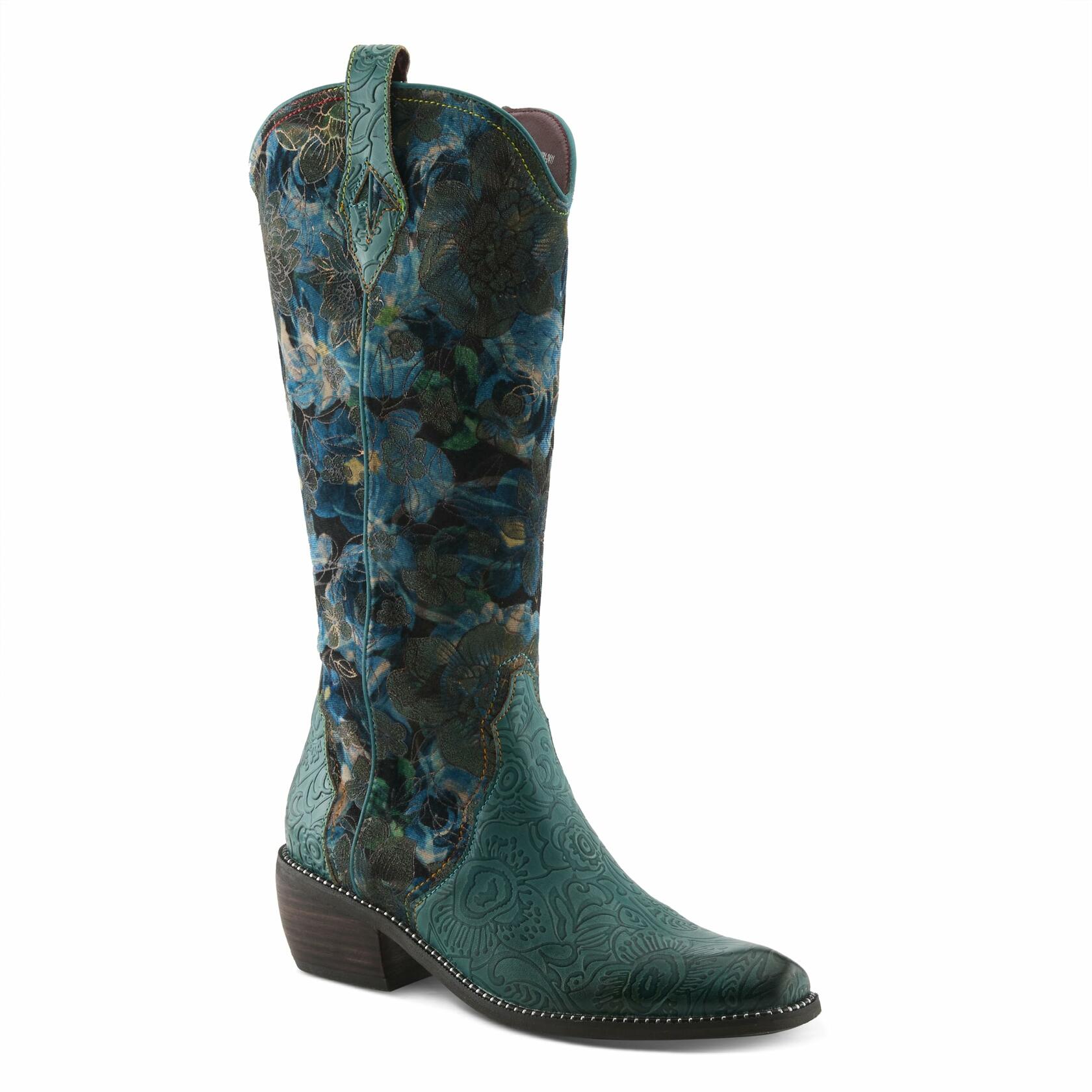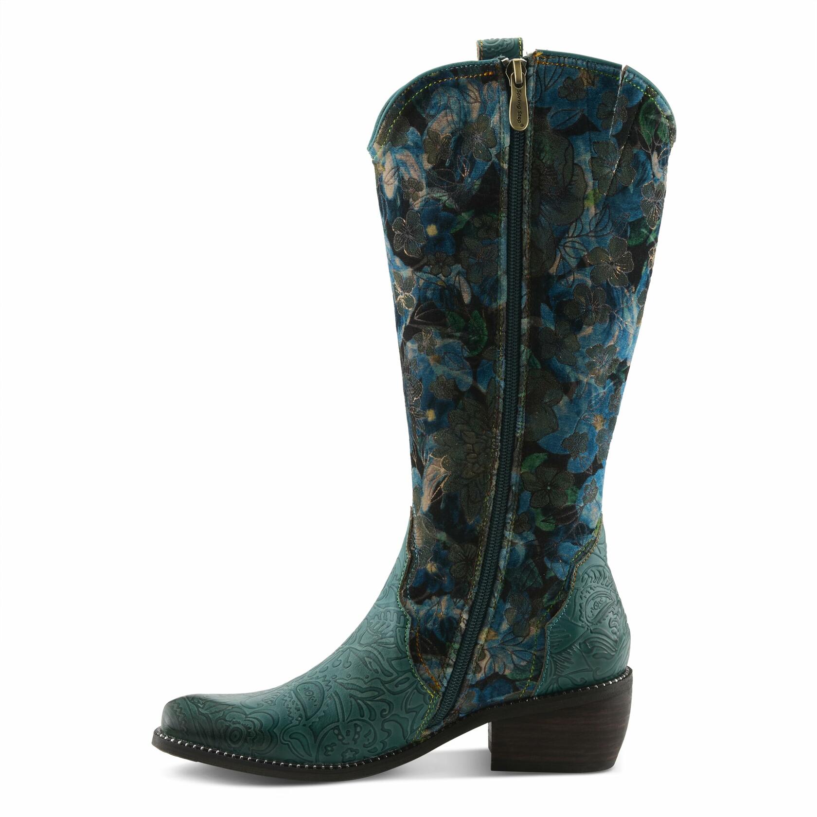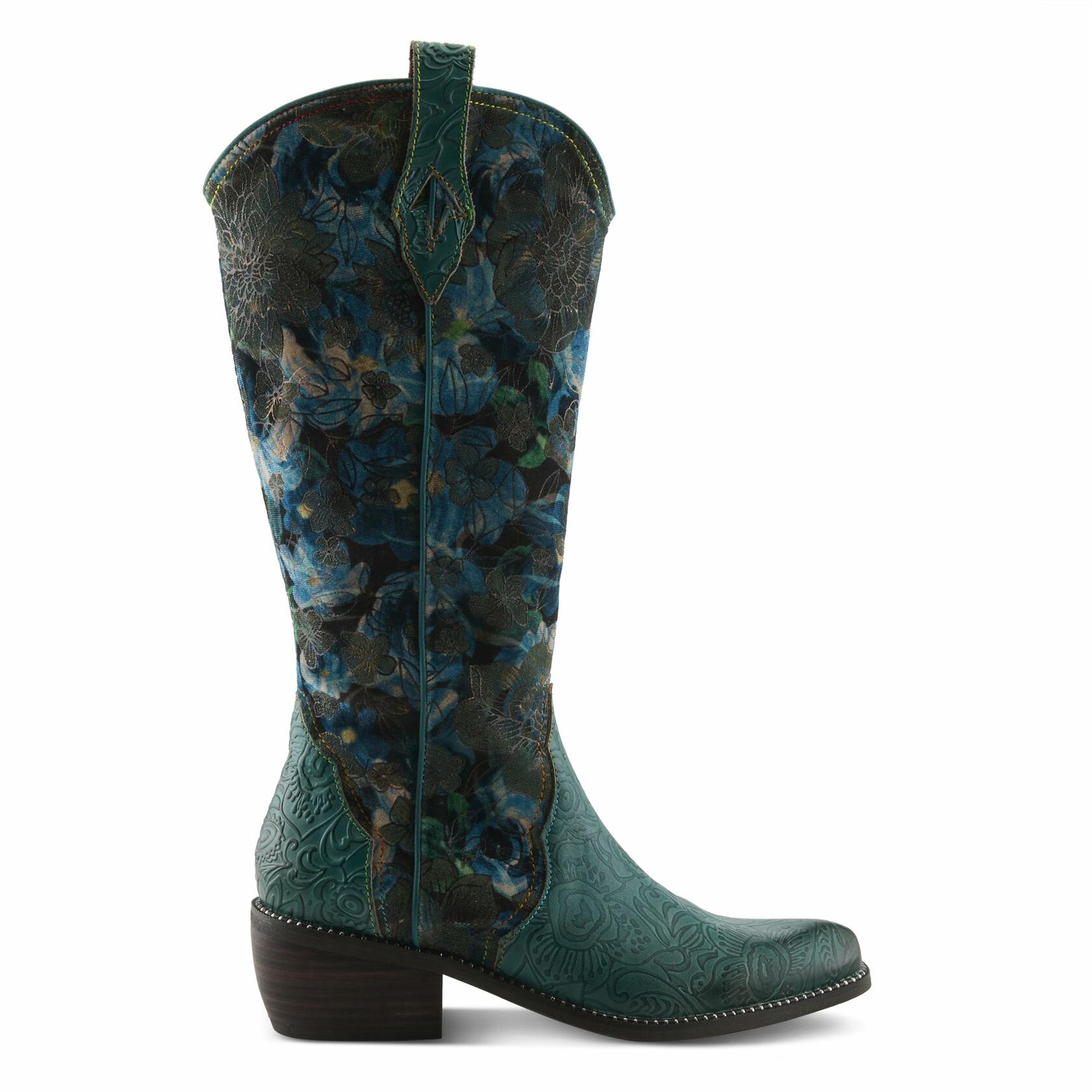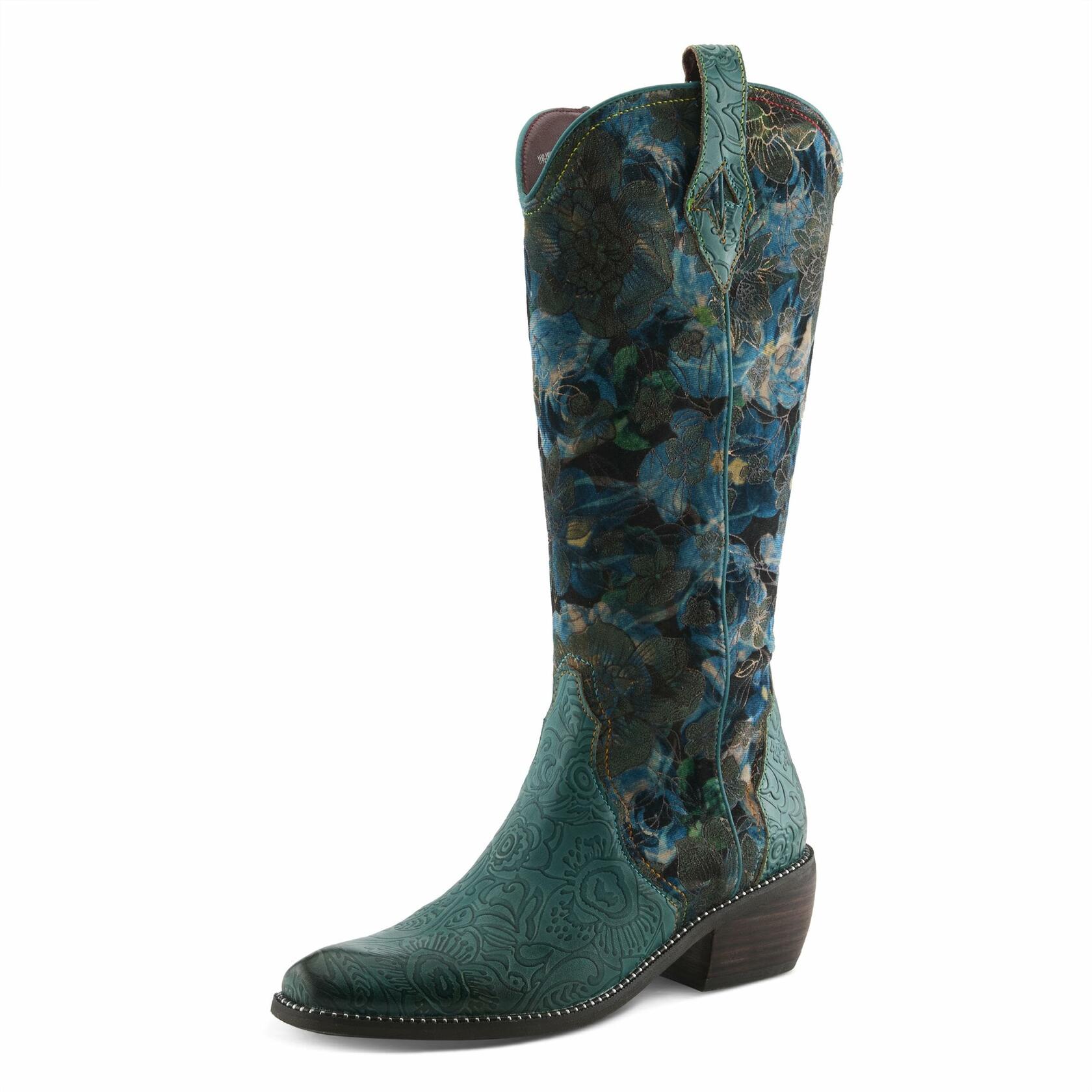 L`ARTISTE Style: RODEOQUEEN-VIV Whether you're line dancing or just running errands, these boots let you channel your inner cowgirl chic. Slip them on with your favorite jeans or dress to add that perfect dose of western flair to any outfit. Saddle up and get ready to turn heads in the new RODEOQUEEN-VIV boots! Upper: Leather, Velvet Lining: Velvet Insole: Synthetic Leather Outsole: Rubber Closure: Zipper Heel Height: 2" Shaft Height: 14" Circumference: 14" Features: - Fit Recommendation: Fits true to size - Intricate tonal embossed designs on the front and back heel for eye-catching texture - Soft printed floral velvet shaft adds a feminine, romantic vibe - Snip toe front gives An authentic cowgirl look - Stacked wooden heel for that authentic cowboy silhouette with stability Disclaimer: LArtiste products are made with natural tanned leather using traditional hand painting techniques. This unique finishing process is used to create a natural effect with color variations to deliver authentic look and beauty.