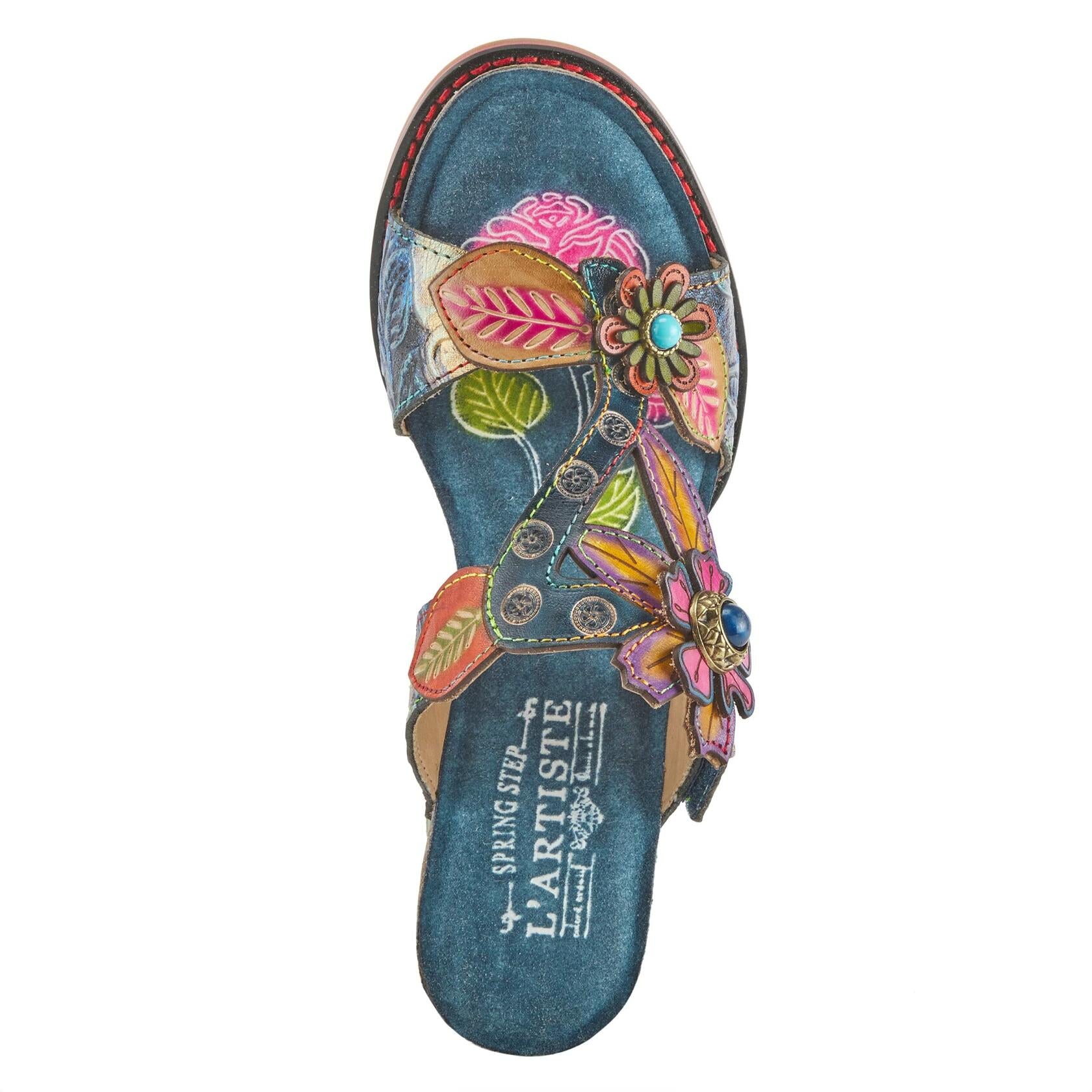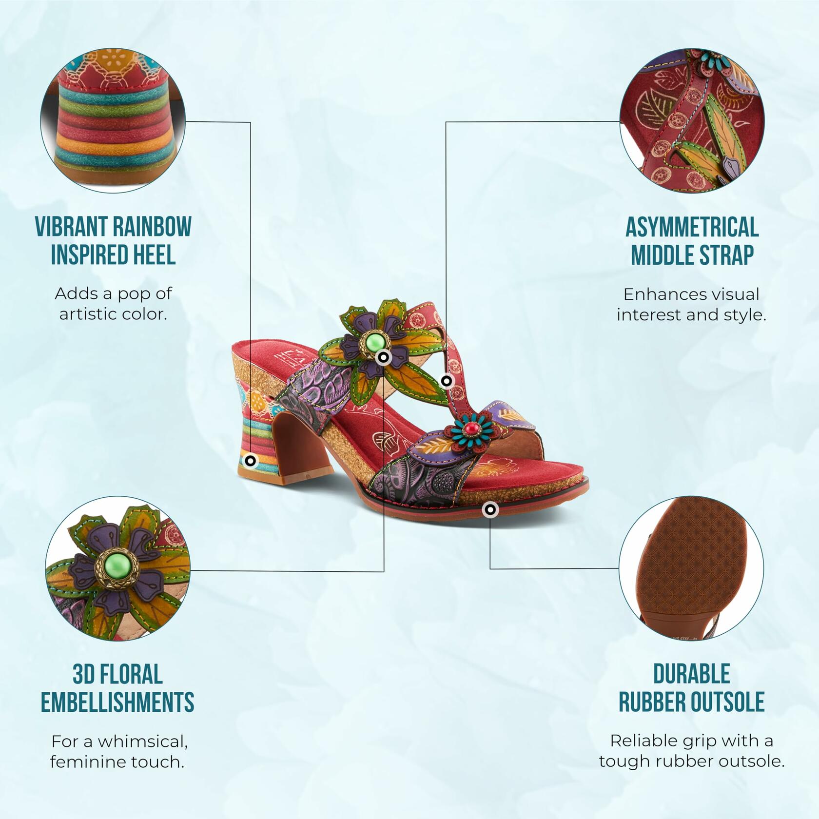 L'Artiste Style: ROSSIE These shoes are pieces of art for your feet. This rainbow heel and unique color combinations really make this shoe stand out. Features asymmetrical middle strap, decorative metal buttons on the side and 3D flowers with ornate buttons. Upper: Leather Lining: Synthetic Insole: Textile Outsole: Rubber Closure: Hook&Loop, Slip-on Heel Height: 2.75" Platform Height: 1" Features: - Adjustable Disclaimer: L'Artiste products are made with natural tanned leather using traditional hand painting techniques. This unique finishing process is used to create a natural effect with color variations to deliver authentic look and beauty.