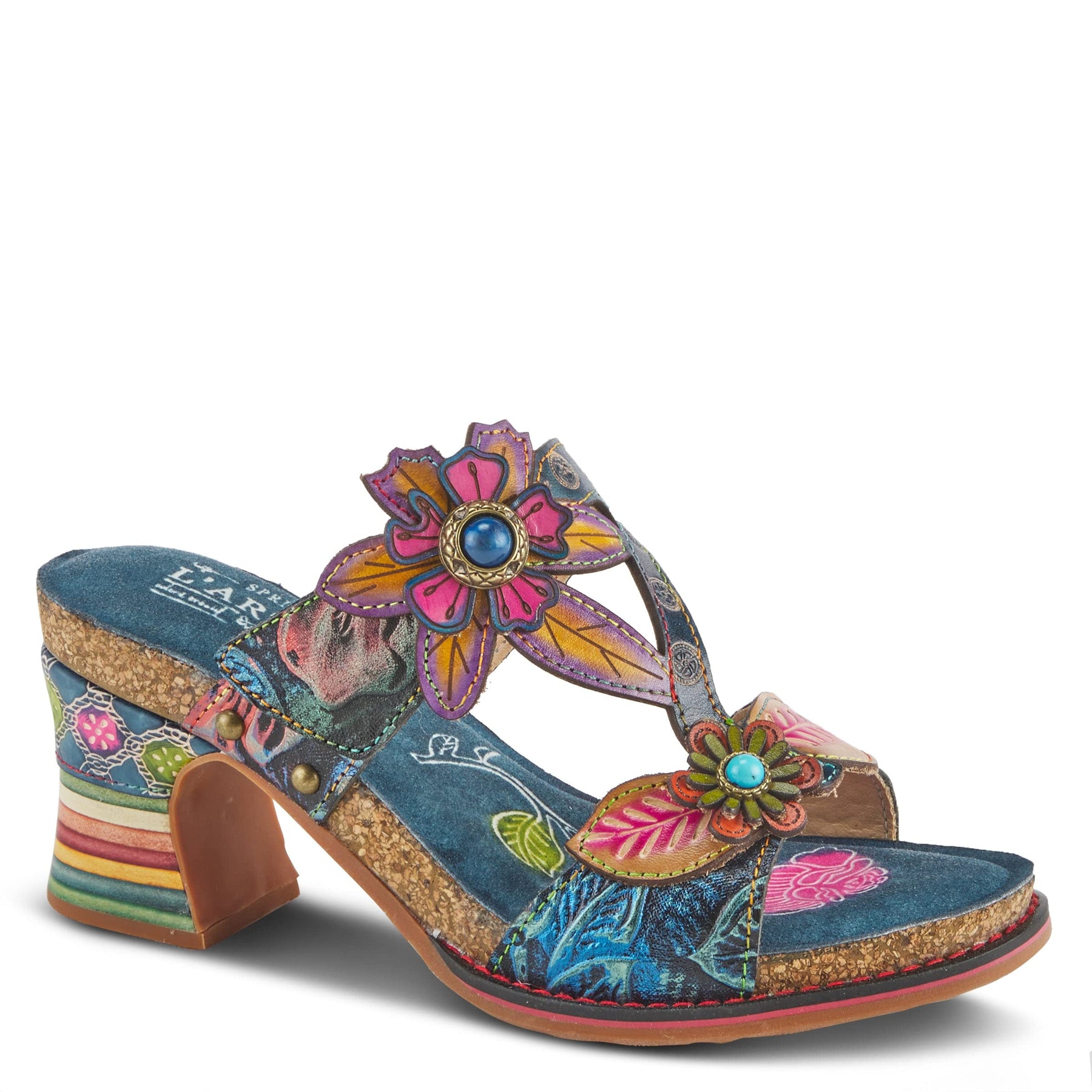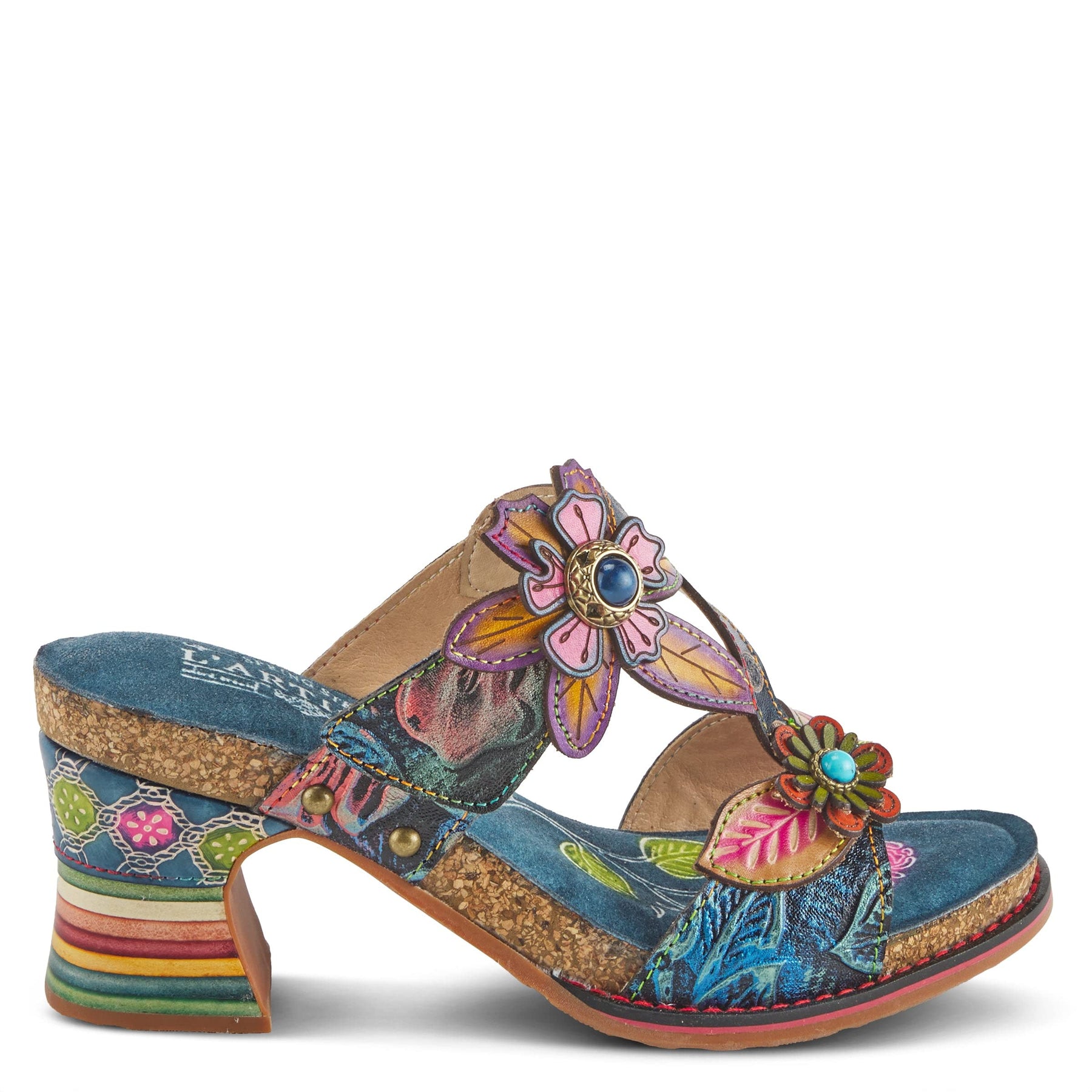 L'Artiste Style: ROSSIE These shoes are pieces of art for your feet. This rainbow heel and unique color combinations really make this shoe stand out. Features asymmetrical middle strap, decorative metal buttons on the side and 3D flowers with ornate buttons. Upper: Leather Lining: Synthetic Insole: Textile Outsole: Rubber Closure: Hook&Loop, Slip-on Heel Height: 2.75" Platform Height: 1" Features: - Adjustable Disclaimer: L'Artiste products are made with natural tanned leather using traditional hand painting techniques. This unique finishing process is used to create a natural effect with color variations to deliver authentic look and beauty.