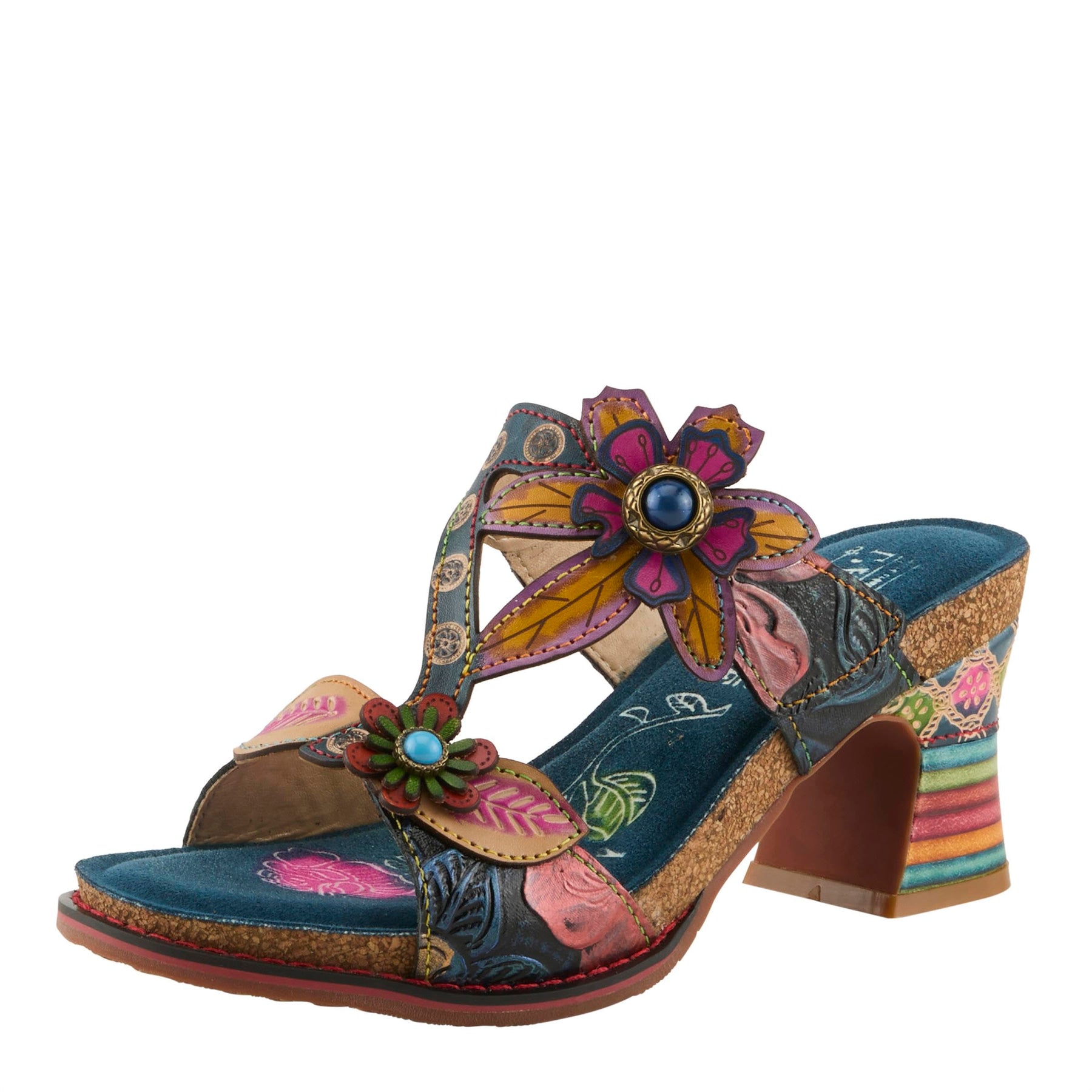 L'Artiste Style: ROSSIE These shoes are pieces of art for your feet. This rainbow heel and unique color combinations really make this shoe stand out. Features asymmetrical middle strap, decorative metal buttons on the side and 3D flowers with ornate buttons. Upper: Leather Lining: Synthetic Insole: Textile Outsole: Rubber Closure: Hook&Loop, Slip-on Heel Height: 2.75" Platform Height: 1" Features: - Adjustable Disclaimer: L'Artiste products are made with natural tanned leather using traditional hand painting techniques. This unique finishing process is used to create a natural effect with color variations to deliver authentic look and beauty.