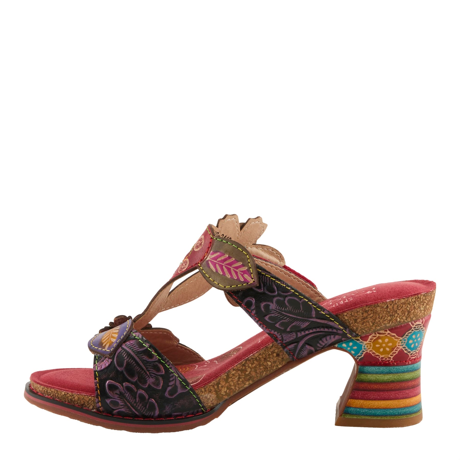 L'Artiste Style: ROSSIE These shoes are pieces of art for your feet. This rainbow heel and unique color combinations really make this shoe stand out. Features asymmetrical middle strap, decorative metal buttons on the side and 3D flowers with ornate buttons. Upper: Leather Lining: Synthetic Insole: Textile Outsole: Rubber Closure: Hook&Loop, Slip-on Heel Height: 2.75" Platform Height: 1" Features: - Adjustable Disclaimer: L'Artiste products are made with natural tanned leather using traditional hand painting techniques. This unique finishing process is used to create a natural effect with color variations to deliver authentic look and beauty.