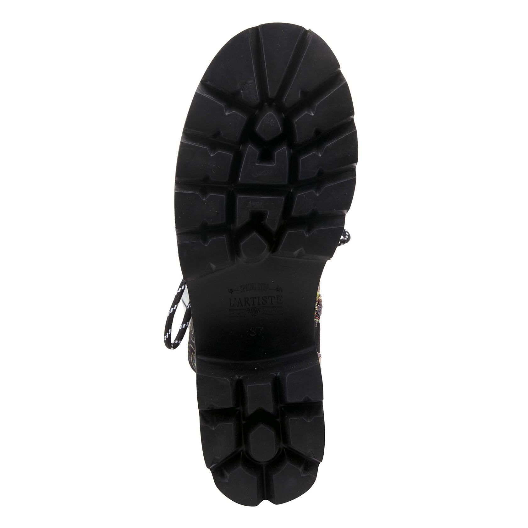 L'Artiste Style: Severe, Severely fabulous, cool, rad and bad- in a good way! These ain't your momma's boots, but she may just try to sneak them out of your closet! Silver studs inlaid in leather, skim the tops of these super trendy lugged platform booties with multi colored cotton laces. Hand painted, carved multi colored leathers edged in antique flat brass studs, and the black grounded metallic printed suede creates a perfectly tuned and rockin modern orchestra. Inside zipper reveals a silky crew cut faux fur lining and padded footbed. Attributes: - Heel Height: 2 1/2" - Platform Height: 1 1/4" - Upper: Leather, Suede - Lining: Velvet, Printed, Synthetic Leather - Insole: Synthetic Leather - Outsole: Rubber - Boot Shaft: 6" - Boot Circum.: 9 1/4"-11" - Closure: Lace-up, Zipper - Features: Adjustable, Comfort, Embroidered, Hand-painted, Padded Insole, Premium, Textured Imported Disclaimer: LArtiste products are made with natural tanned leather using traditional hand painting techniques. This unique finishing process is used to create a natural effect with color variations to deliver authentic look and beauty.