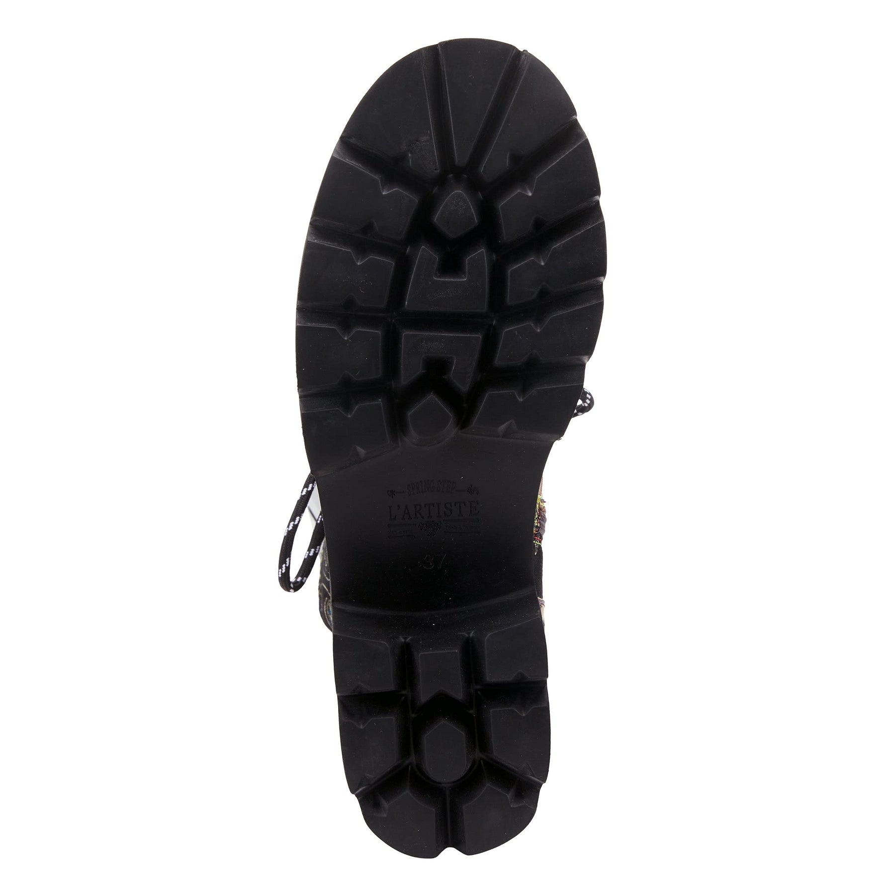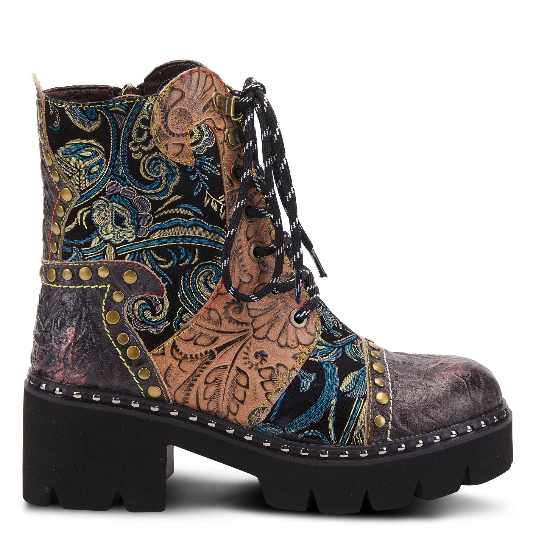 L'Artiste Style: Severe, Severely fabulous, cool, rad and bad- in a good way! These ain't your momma's boots, but she may just try to sneak them out of your closet! Silver studs inlaid in leather, skim the tops of these super trendy lugged platform booties with multi colored cotton laces. Hand painted, carved multi colored leathers edged in antique flat brass studs, and the black grounded metallic printed suede creates a perfectly tuned and rockin modern orchestra. Inside zipper reveals a silky crew cut faux fur lining and padded footbed. Attributes: - Heel Height: 2 1/2" - Platform Height: 1 1/4" - Upper: Leather, Suede - Lining: Velvet, Printed, Synthetic Leather - Insole: Synthetic Leather - Outsole: Rubber - Boot Shaft: 6" - Boot Circum.: 9 1/4"-11" - Closure: Lace-up, Zipper - Features: Adjustable, Comfort, Embroidered, Hand-painted, Padded Insole, Premium, Textured Imported Disclaimer: L’Artiste products are made with natural tanned leather using traditional hand painting techniques. This unique finishing process is used to create a natural effect with color variations to deliver authentic look and beauty.