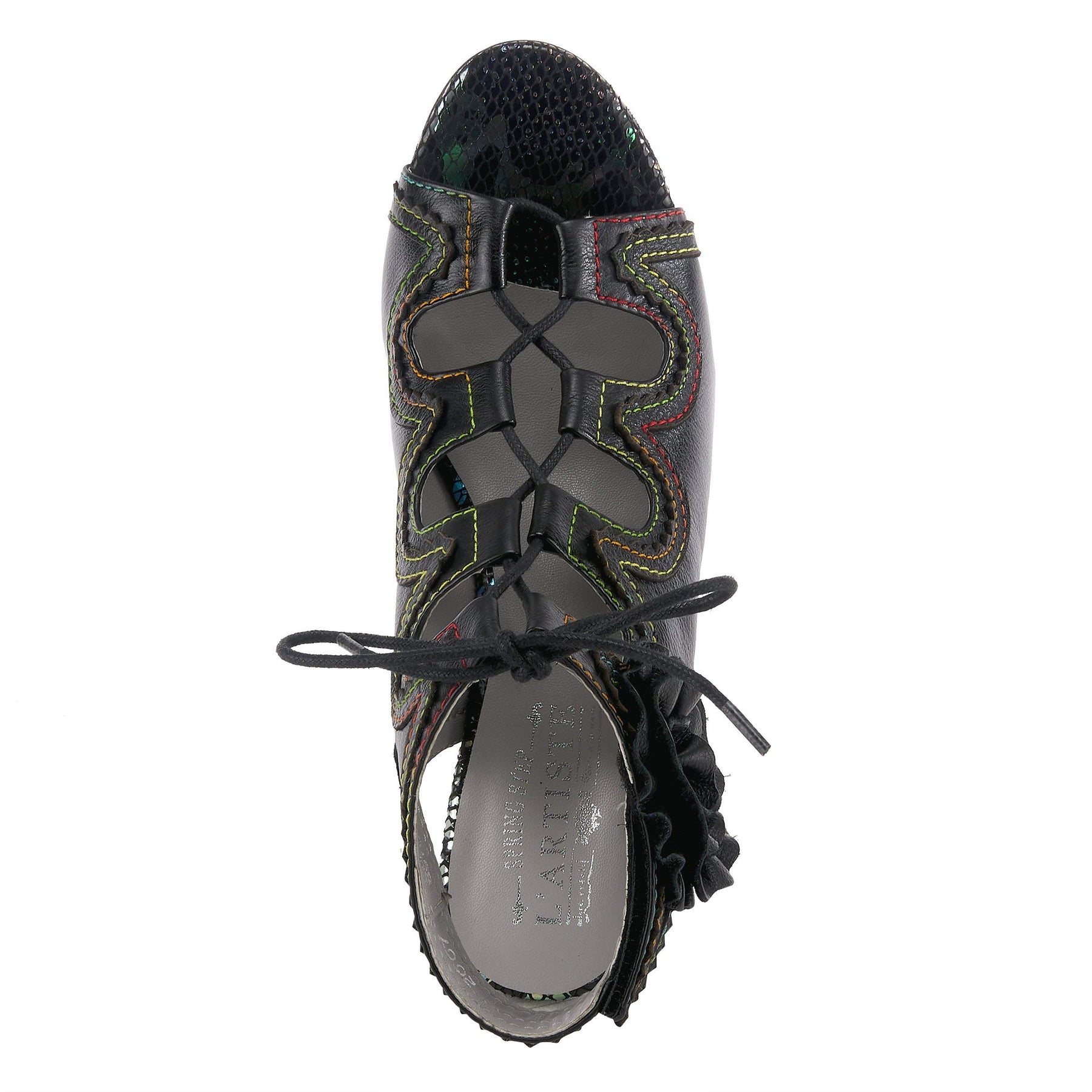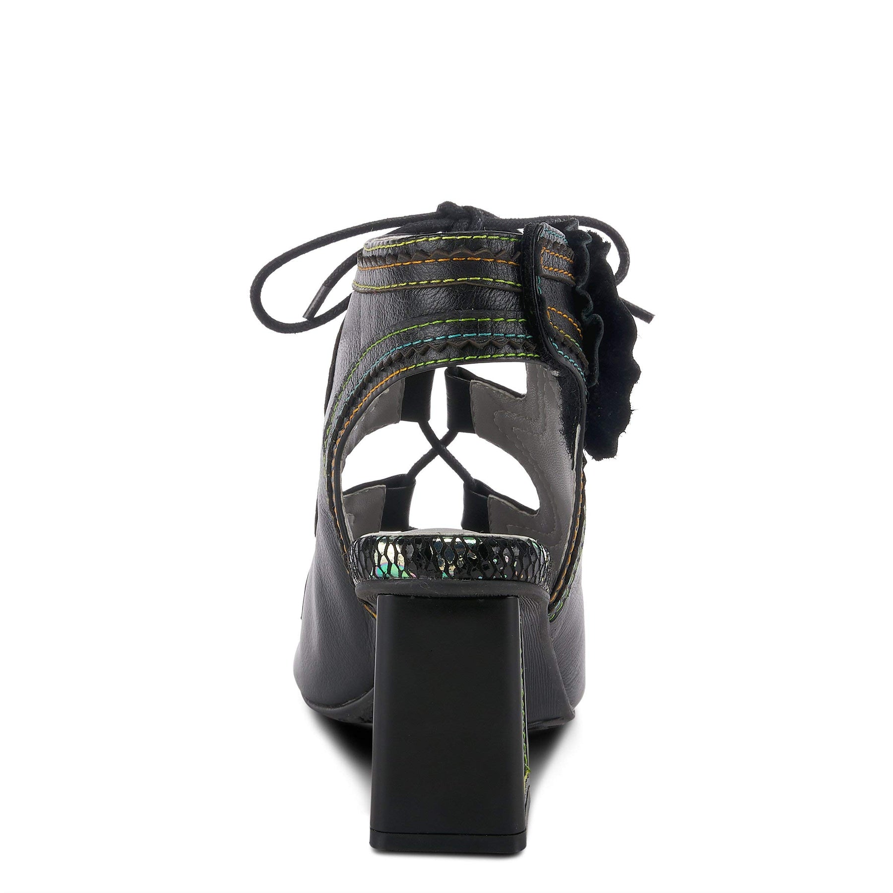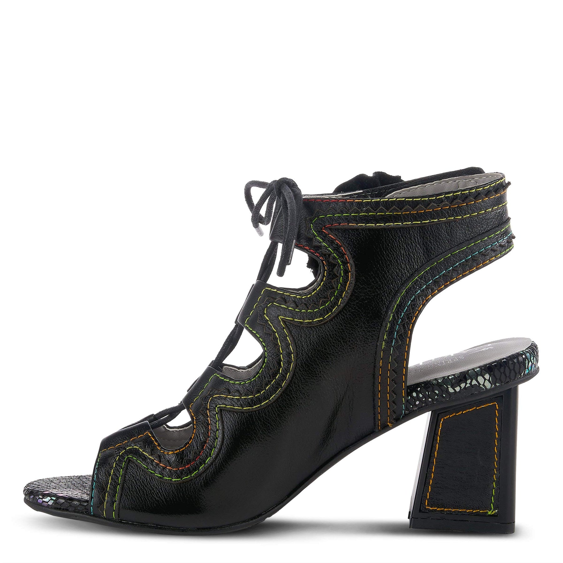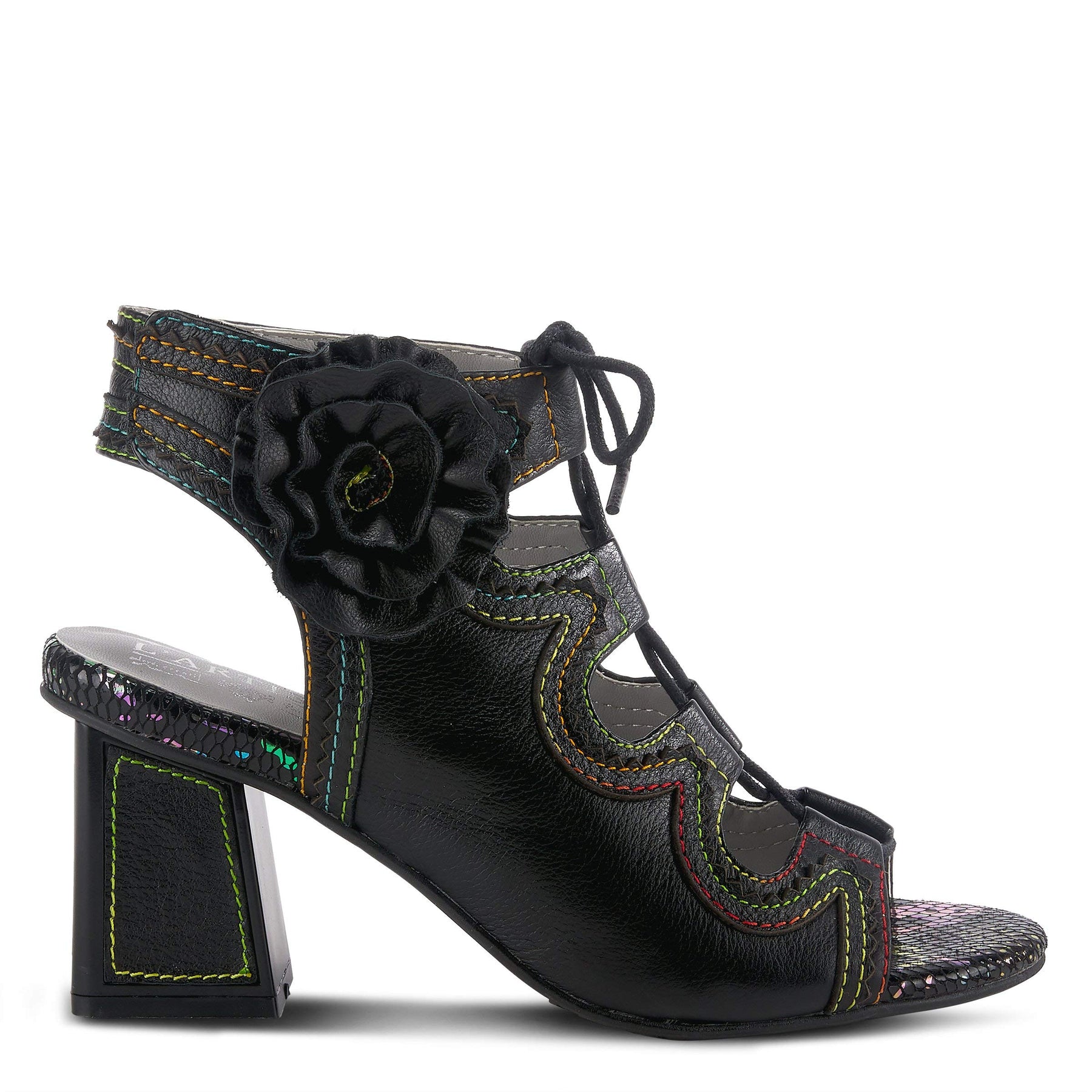 L'Artiste Style: Supercute French inspired, hand-painted burnished leather ghillie sandal featuring a hook and loop closure ankle strap with a decorative flower, rainbow stitching and waxed cotton laces on an architectural block heel. Heel Height: 3 1/4" Platform Height: 1/2" Features: - Heel Type: Architectural, Block, Chunky, Square - Toe Type: Almond toe, Open toe - Features: Adjustable, Comfort, Hand-painted, Padded Insole, Premium - Upper: Leather - Lining: Synthetic - Insole: Synthetic - Outsole: Rubber - Closure: Hook & Loop, Lace-up
