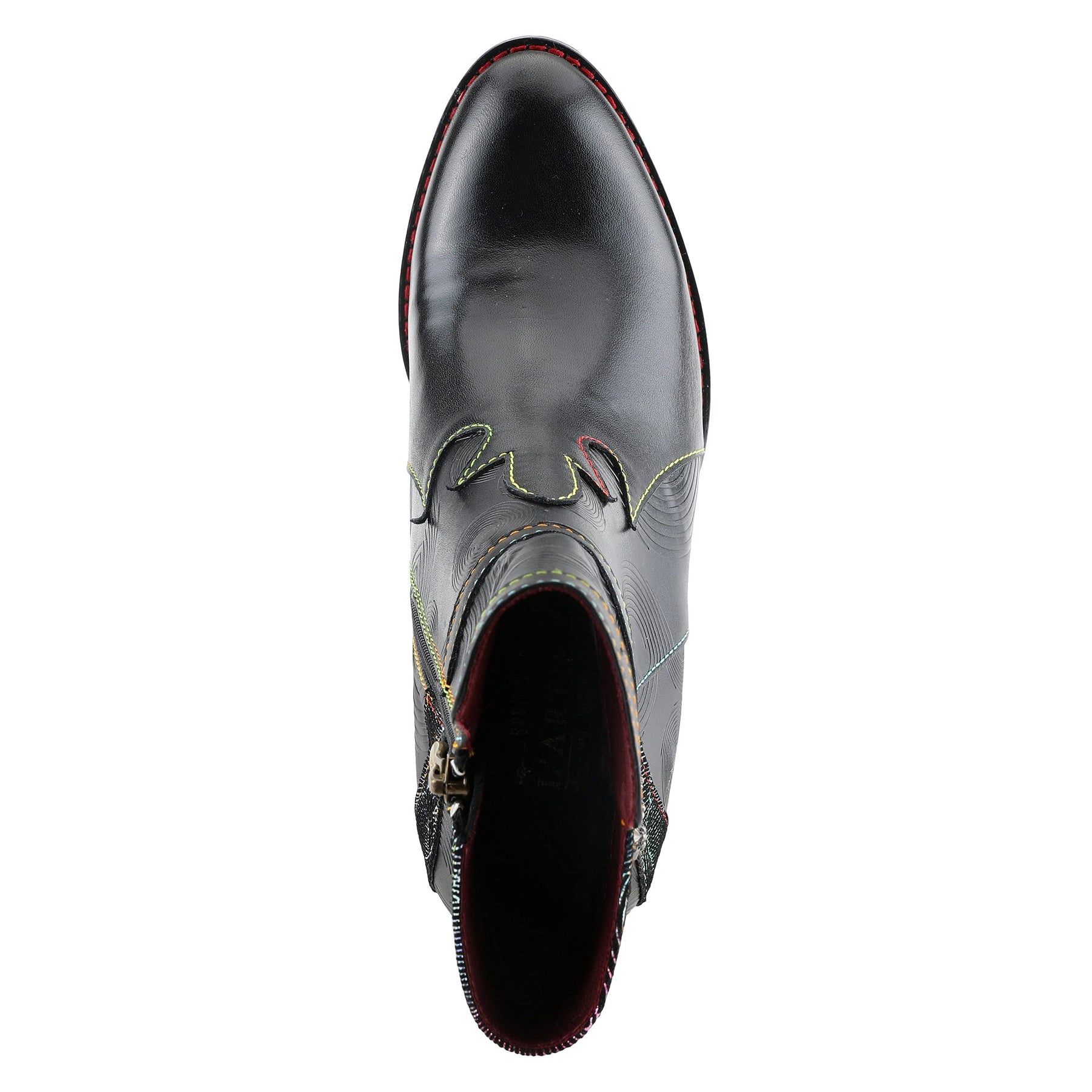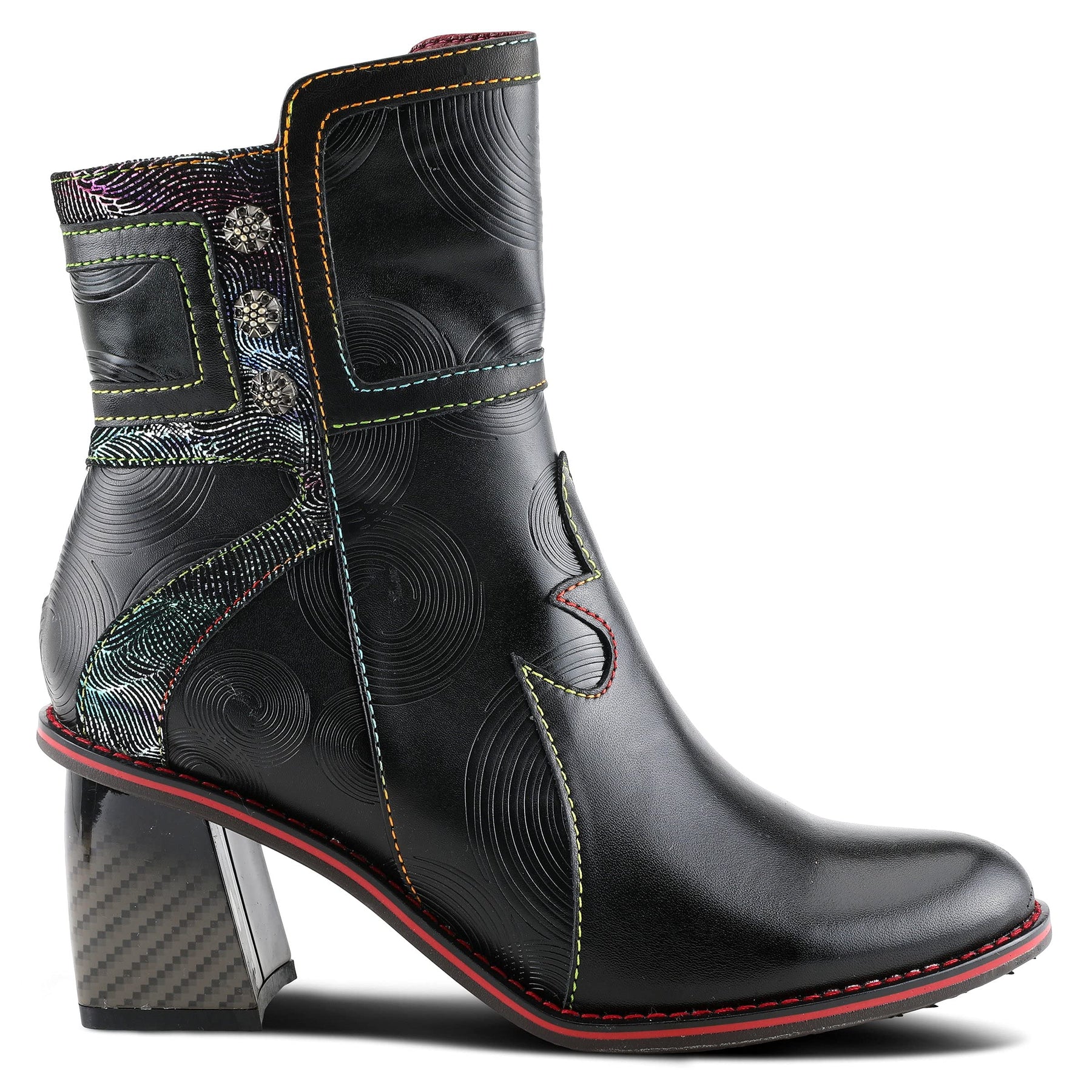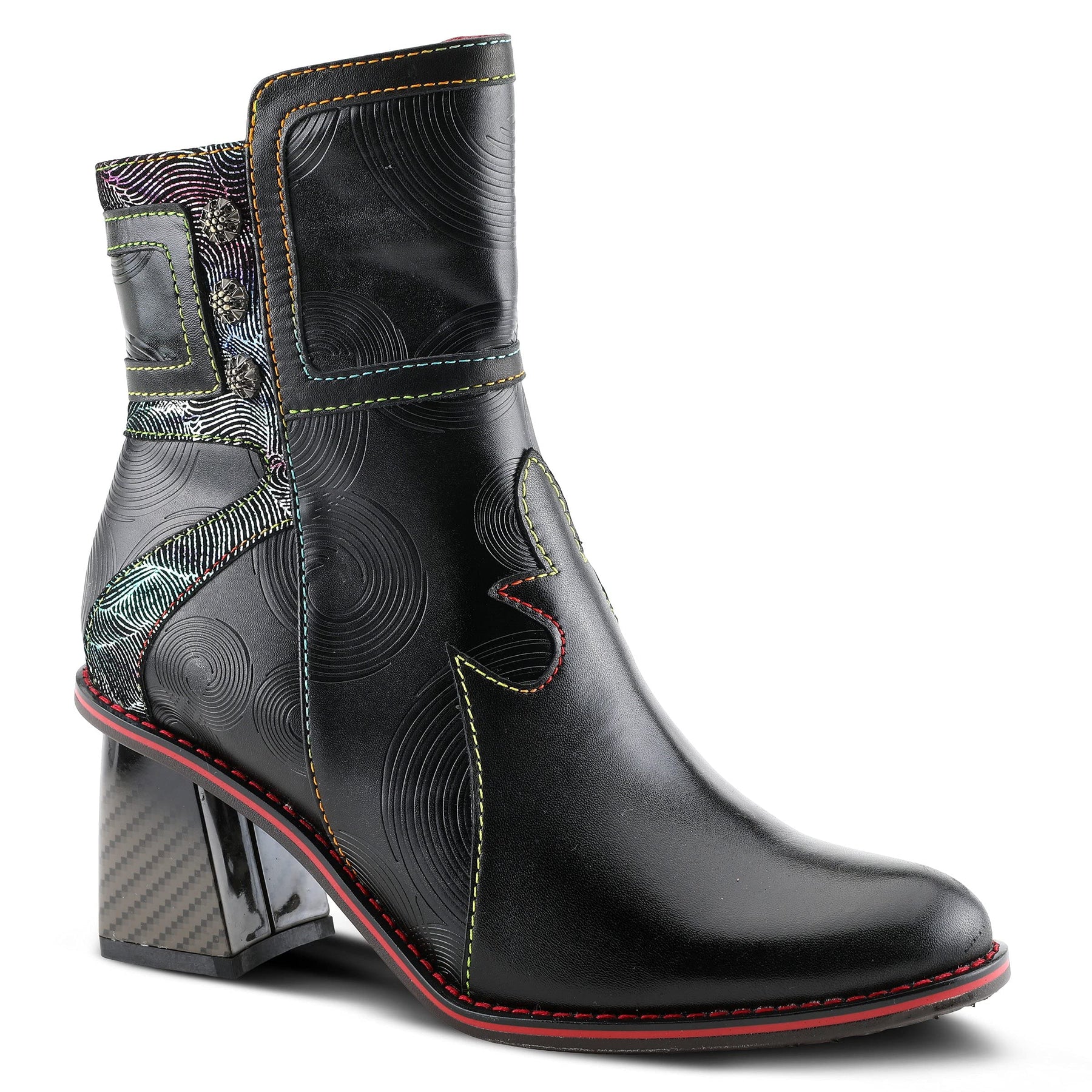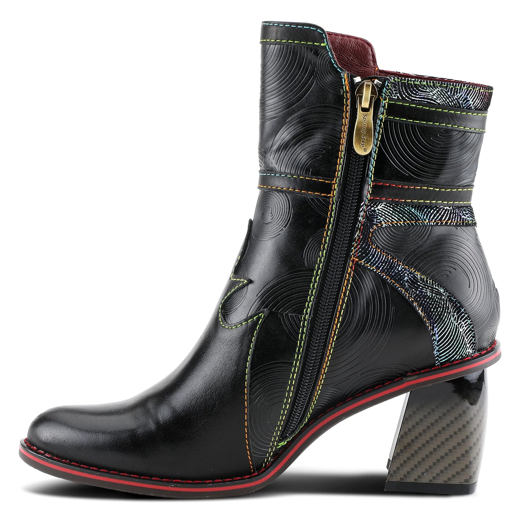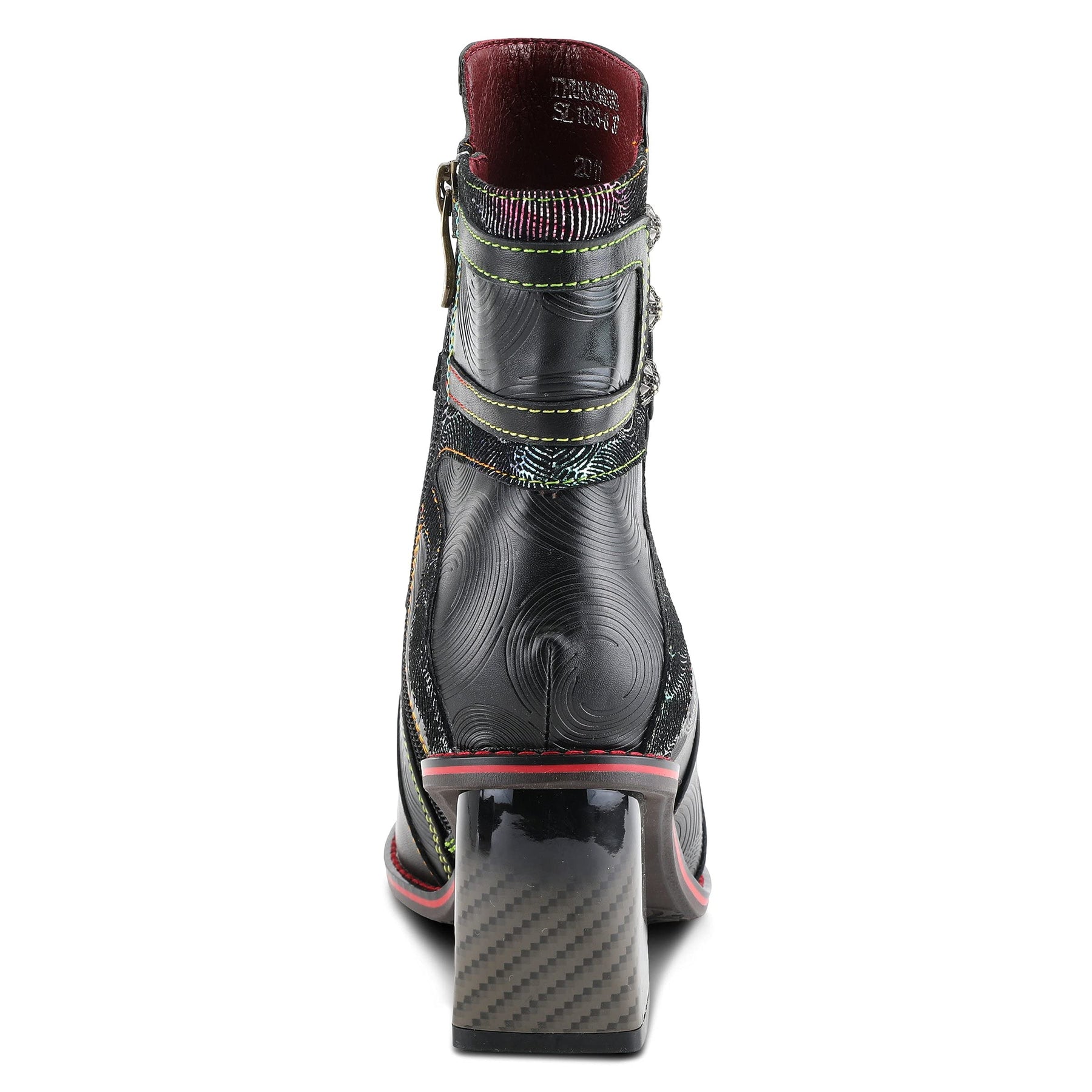 L'ARTISTE Style: THUNDERBIRD Showstopping leather combination bootie featuring a swirl embossed design with a burnished toe on a unique complementary comfort heel. Upper: Leather, Textile Lining: Synthetic, Textile Insole: Synthetic Outsole: Rubber Closure: Zipper Heel Height: 2 /12" Platform Height: 1/3" Shaft Height: 5 1/4" Circumference: 10" Features: - Comfort, Flexible Sole, Hand-painted, Padded Insole, Premium Disclaimer: LArtiste products are made with natural tanned leather using traditional hand painting techniques. This unique finishing process is used to create a natural effect with color variations to deliver authentic look and beauty.