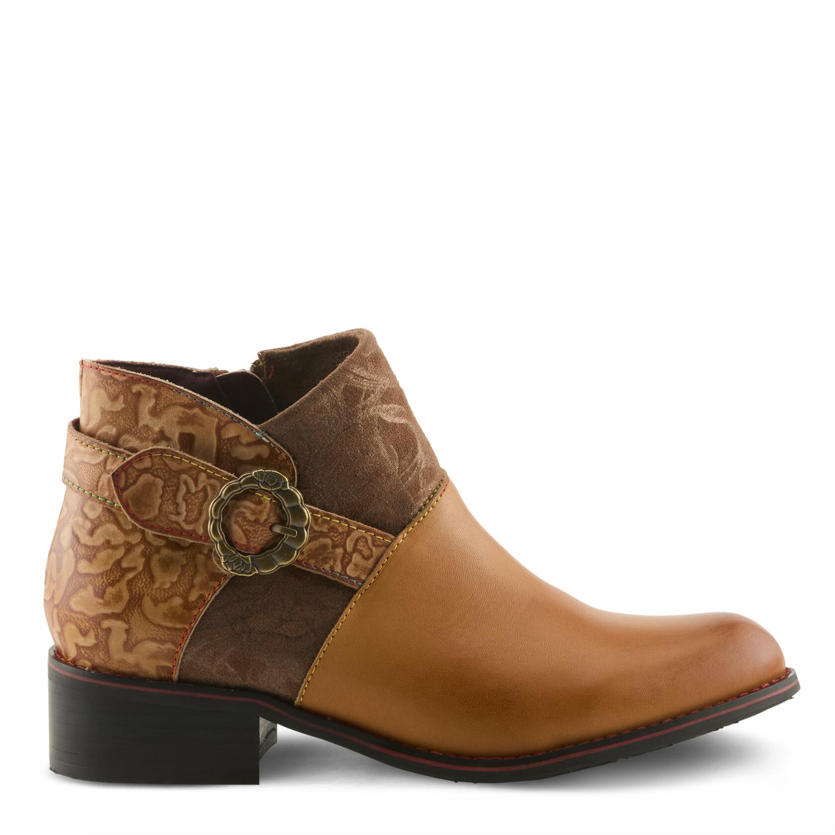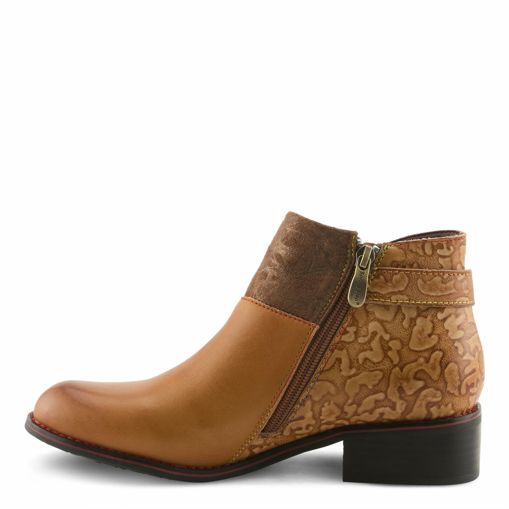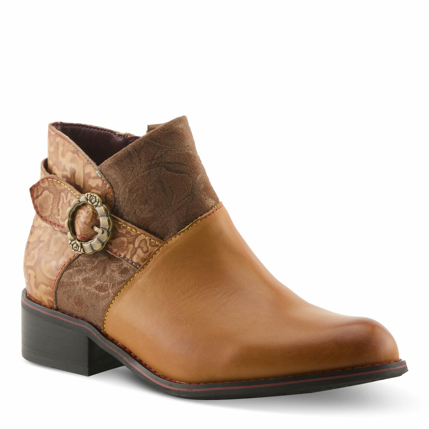 L'Artiste Style: Tiatia Sexy little side dipped ankle bootie with decorative antique brass rose buckle and inside zipper. The perfect trifecta of premium solid leather, hand painted abstract embossed leather and soft metallic tone on tone ultra suede. A pop of red contrasting welt stitching and outsole with plenty of flex and super padded footbed for all day fashion good looks and into the night continuous comfort. Attributes: - Heel Height: 1 5/8" - Platform Height: 1/4" - Upper: Leather, Micro suede - Lining: Velvet, Printed, Synthetic Leather, Micro suede - Insole: Synthetic Leather - Outsole: Rubber - Boot Shaft: 4" - Boot Circum.: 9 1/2" - Closure: Zipper - Features: Comfort, Hand-painted, Padded Insole, Premium, Textured, Flexible Sole Imported Disclaimer: LArtiste products are made with natural tanned leather using traditional hand painting techniques. This unique finishing process is used to create a natural effect with color variations to deliver authentic look and beauty.