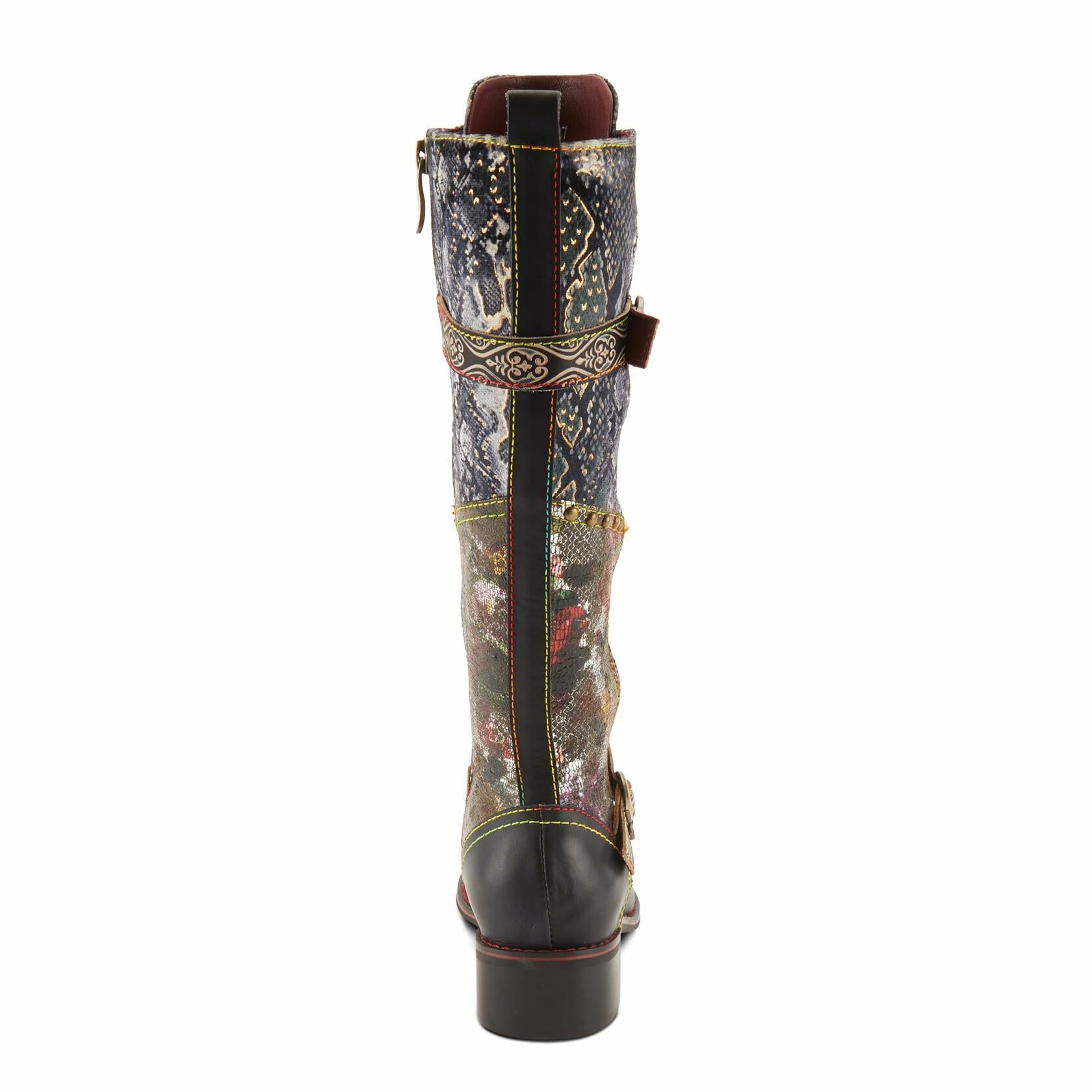 Step out in style with the L'Artiste Vaneyck tall boots, a perfect blend of bold fashion and everyday functionality. Designed for women who love to make a statement, these boots feature a striking multi colored iridescent and metallic upper that adds vibrant color and texture to any outfit. The decorative double buckle applique adds an edgy touch to the design, while the playful rainbow stitching provides an unexpected pop of personality. Combining fashion with practicality, these boots feature both lace up and zipper closures for a secure, customized fit and effortless on and off wear. Comfort is a top priority, with a padded insole and flexible rubber outsole that provide support for all day wear. The 1 1/2" heel height is stylish yet manageable, making these boots ideal for a variety of occasions. With a 13 3/4" shaft height and a circumference of 14–14 1/2", they are designed to fit comfortably while flattering your legs. Crafted from premium materials, including leather, textile, velvet and rubber, these boots combine durability and elegance. The synthetic insole ensures long lasting wear, while the textured and hand painted finish enhances the overall appeal. Discover the perfect combination of artistry, comfort and bold design with these statement boots, designed to keep you looking and feeling your best all day long. Features: Multi colored iridescent and metallic upper. Lace up and zipper closure for a convenient fit. Hand painted leather with unique color variations. Padded insole and flexible rubber sole. Decorative double buckle applique and rainbow stitching.