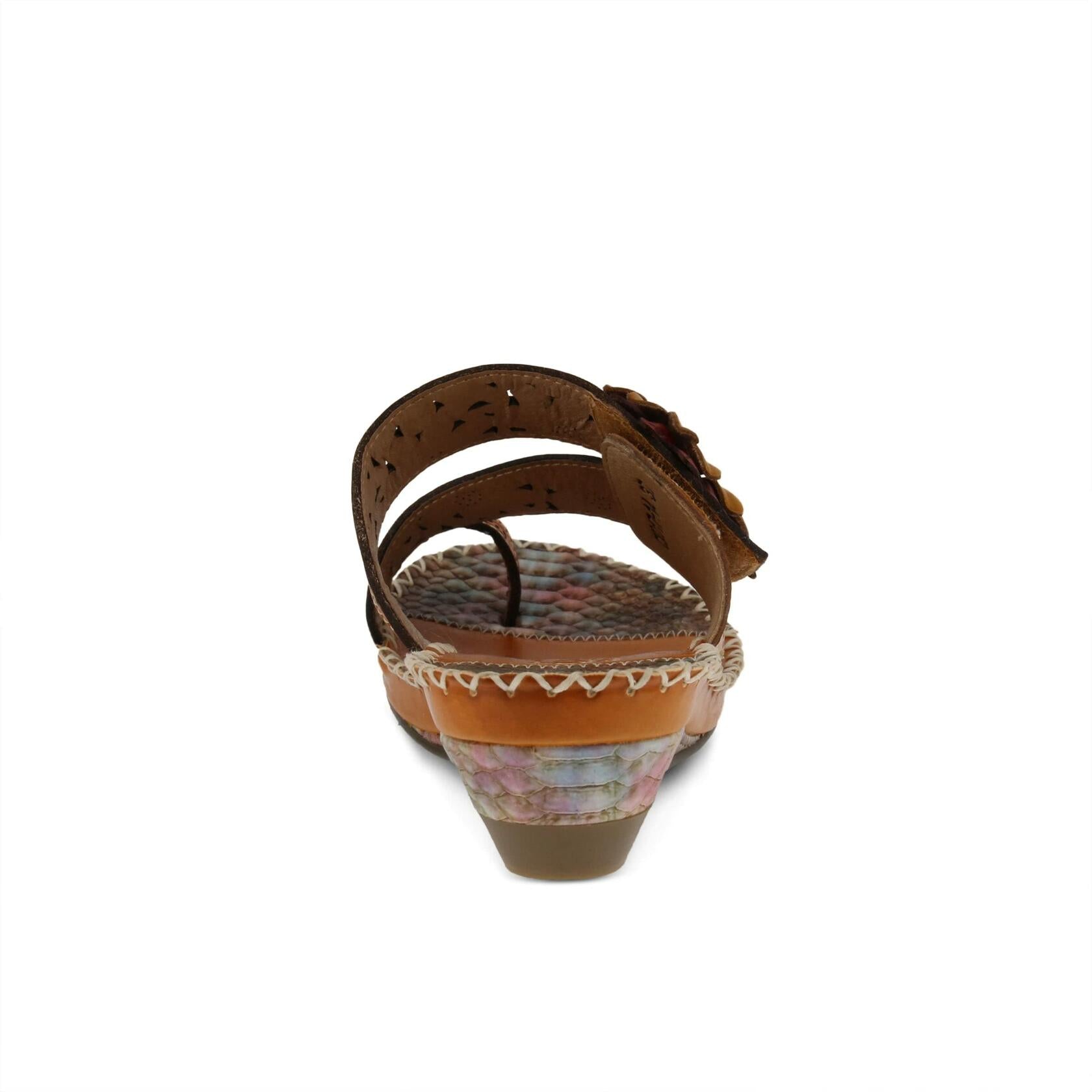 L'Artiste Style: Vardi French inspired, hand-painted leather toe loop slide sandal featuring asymmetrical floral laser etching and cutout design with a dainty ornate leather flower and stone applique. Heel Height (approximately): 1 3/4", 3/4" platform Features: -High quality leather upper, round toe silhouette, rainbow python-wrapped wedge and insole. -Adjustable hook and loop strap. -Synthetic leather lining. -Leather and synthetic leather comfort padded insole. -Rubber outsole featuring artisan whip stitch construction. -Imported. Disclaimer: LArtiste products are made with natural tanned leather using traditional hand painting techniques. This unique finishing process is used to create a natural effect with color variations to deliver authentic look and beauty.