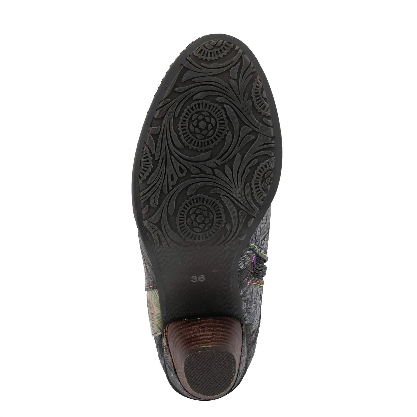 The L'Artiste by Spring Step Waterlily Ankle Boot is a French-designed bootie that features embossed detail, vibrant rainbow stitching and an antiqued metal ornament. Almond toe Material-wrapped heel