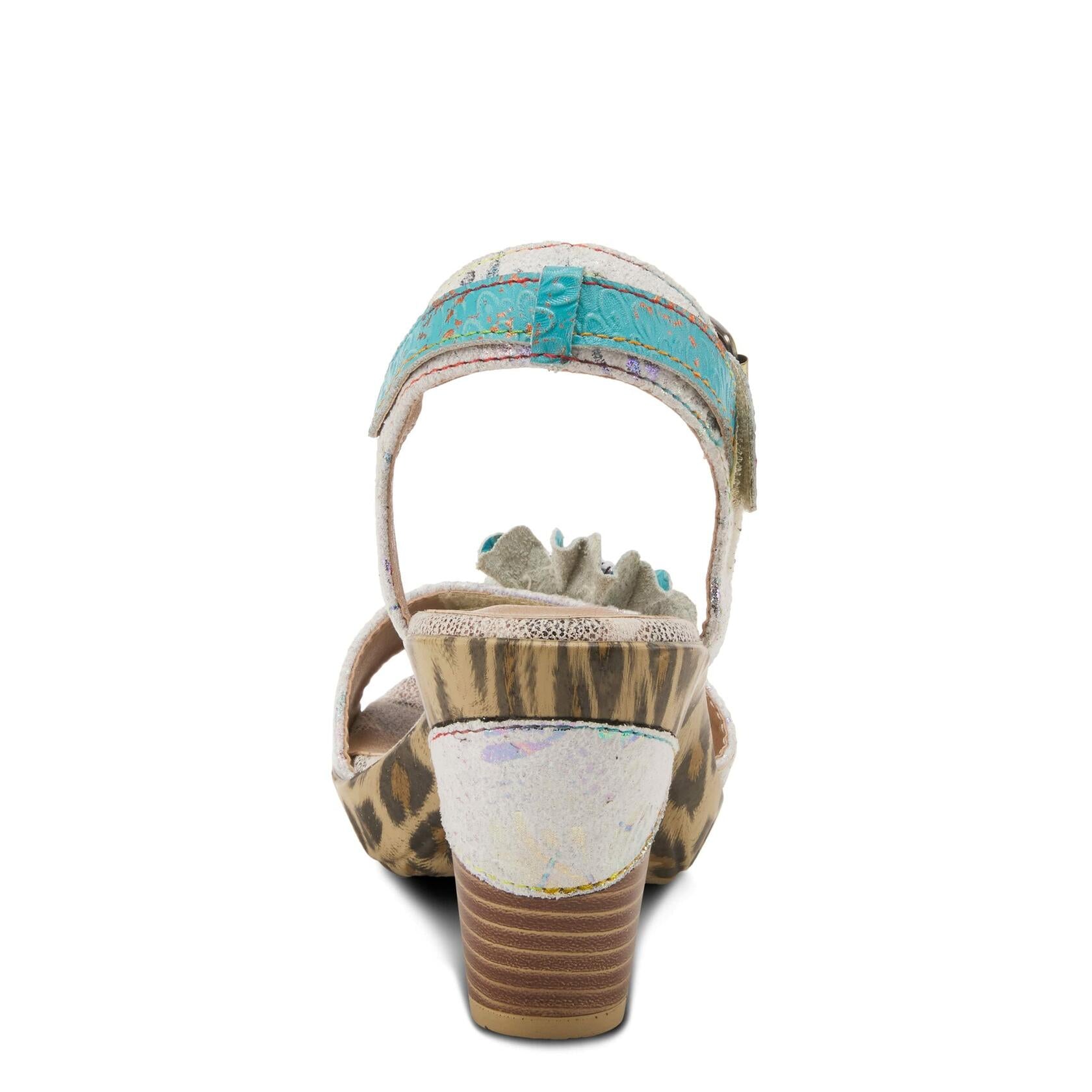 L'ARTISTE Style: WILDCAT French inspired, lightweight quarter strap sandal featuring two adjustable straps with decorative buckle and decorative flower, and padded ankle strap collar on a cone shaped