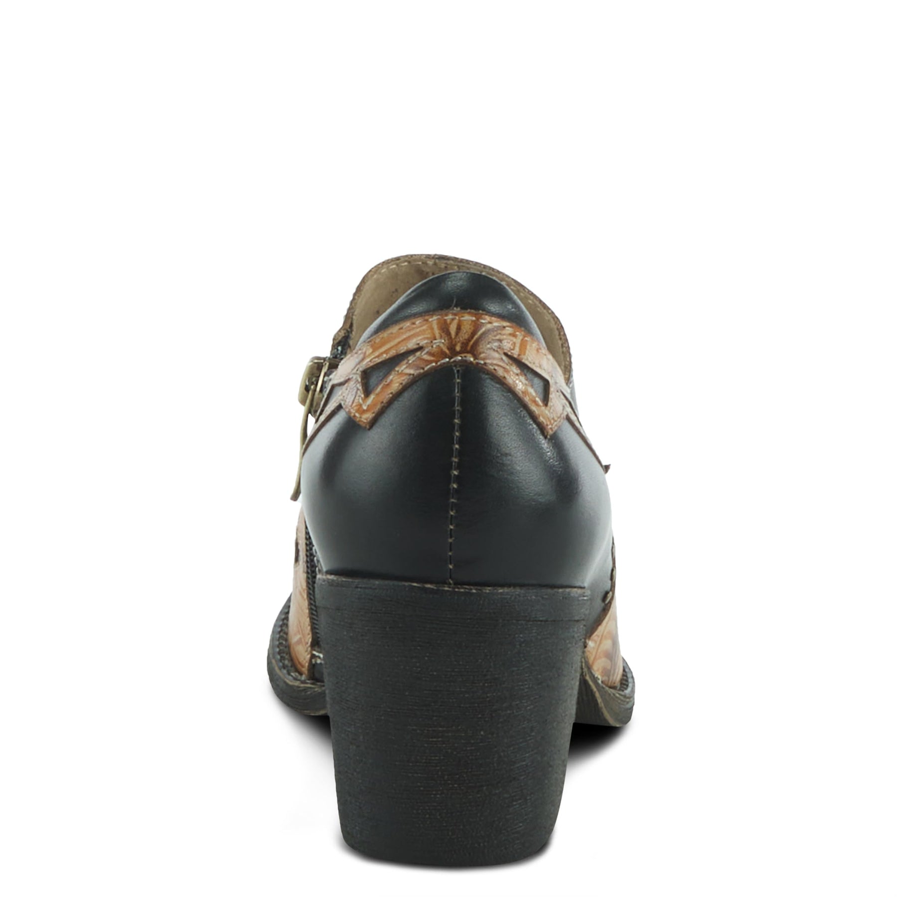 L'ARTISTE Style: ZAPPA This western-inspired shootie with a pointed toe and a functional zipper is a unique and stylish shoe that is sure to turn heads. The brushed and burnished finish of the shoe gives it a rustic look that is perfectly complemented by the hand-painted laser cut geometric graphic design appliques. These intricate designs add a touch of modernity to the otherwise classic western style. The studs that follow the design further enhance the edgy and trendy vibe of the shoe. But despite its striking appearance, the shootie is also practical, with its functional zipper allowing for easy on and off. Whether youre dressing up for a night out or just looking to add some flair to your everyday wardrobe, this shootie is a versatile and stylish choice. Upper: Leather Lining: Microsuede Insole: Microsuede Outsole: Polyurethane, Rubber Closure: Zipper Heel Height: 2 1/2" Features: - Comfort - Hand-painted, Padded Insole, Premium Fit Recommendation: True to Size Disclaimer: LArtiste products are made with natural tanned leather using traditional hand painting techniques. This unique finishing process is used to create a natural effect with color variations to deliver authentic look and beauty.