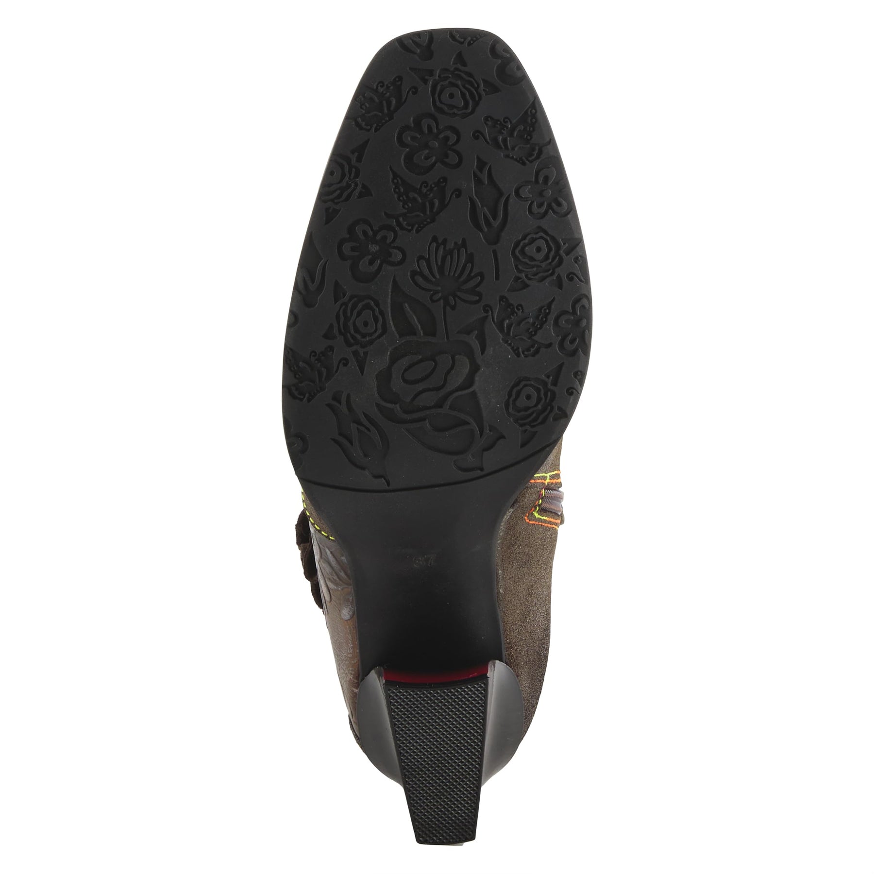 L'ARTISTE Style: ZINNA This boot features a unique and eye-catching design with its architectural sculpted heel and brushed and burnished toe box. The outside decorative flower applique adds a touch of femininity to the design, while the hand-painted geometric multi-colored upper pattern creates a striking contrast against the dark heel and toe box. The rainbow stitching adds a fun and playful element to the overall design, making this boot a great choice for those who want to make a statement with their footwear. The combination of style and comfort makes this boot perfect for any occasion. Upper: Leather, Synthetic Lining: Microsuede, Synthetic Insole: Microsuede, Synthetic Outsole: Rubber Closure: Zipper Heel Height: 2 1/2" Shaft Height: 6 1/4" Circumference: 9 3/4" Features: - Comfort, Flexible Sole - Hand-painted, Padded Insole, Premium, Textured Fit Recommendation: True to Size Disclaimer: LArtiste products are made with natural tanned leather using traditional hand painting techniques. This unique finishing process is used to create a natural effect with color variations to deliver authentic look and beauty.