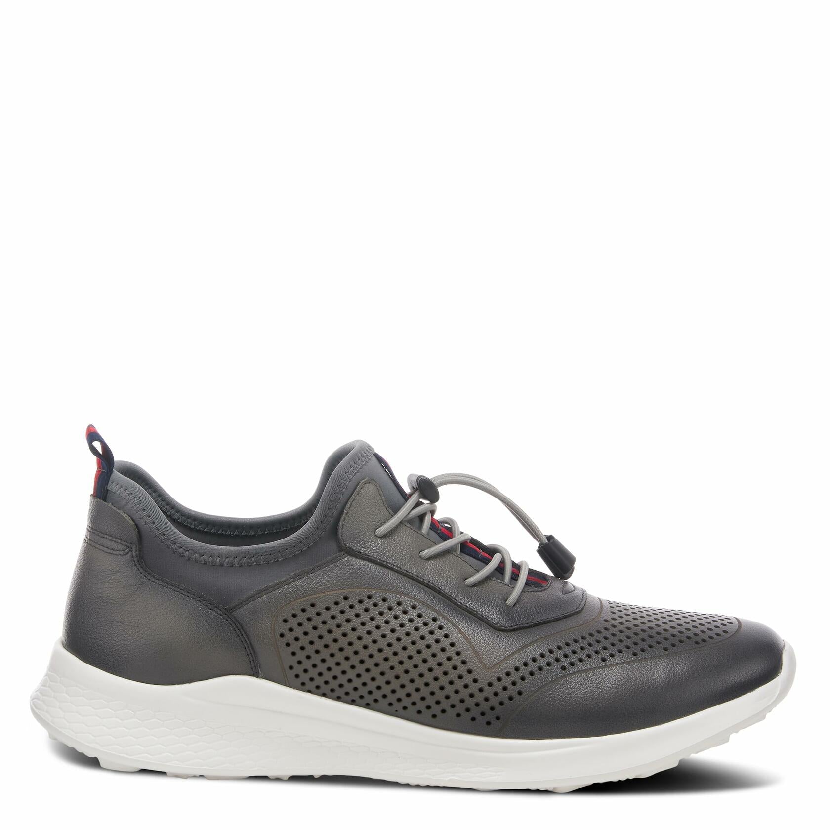 Spring Step Men Style: KRIS Athletic-inspired sneaker featuring a racing strip woven on the upper and heel pull, elastic laces with toggle, and clean perforations on the side and toe area on an all-day-wear OUTSOLE. Upper: Leather Lining: Textile Insole: Leather Outsole: Polyurethane Closure: Toggle Heel Height: 1 1/2" Platform Height: 1" Features: - Adjustable, Comfort, Elastic, Padded Insole, Removable Insole