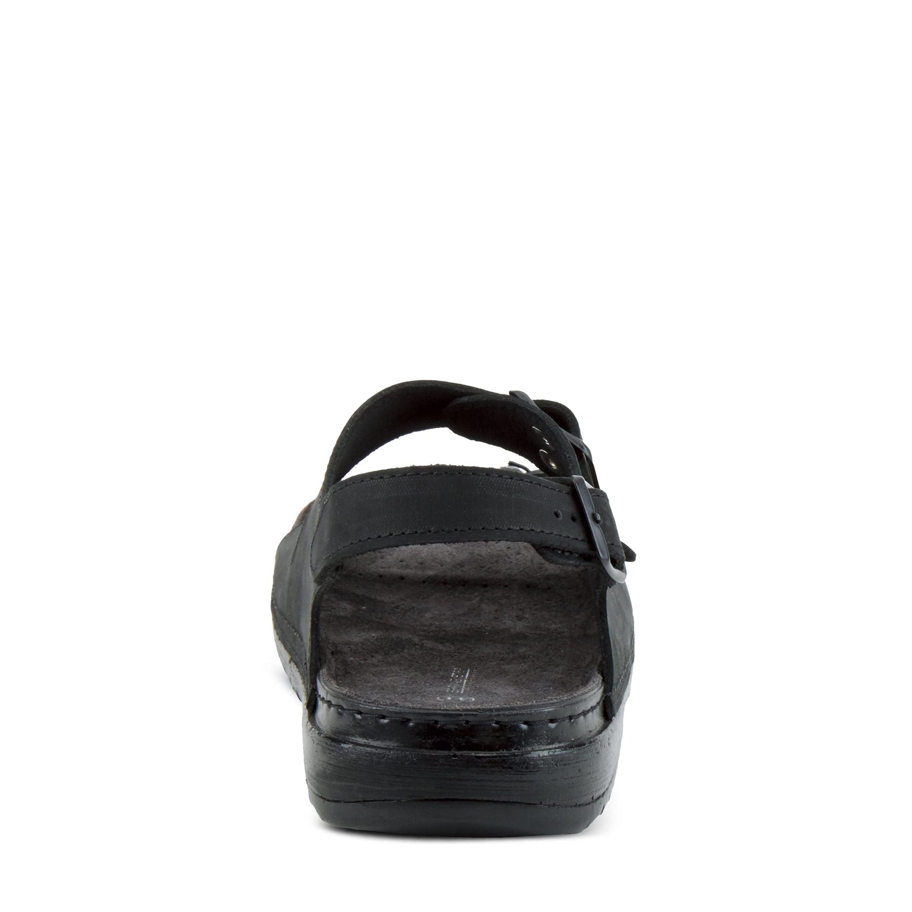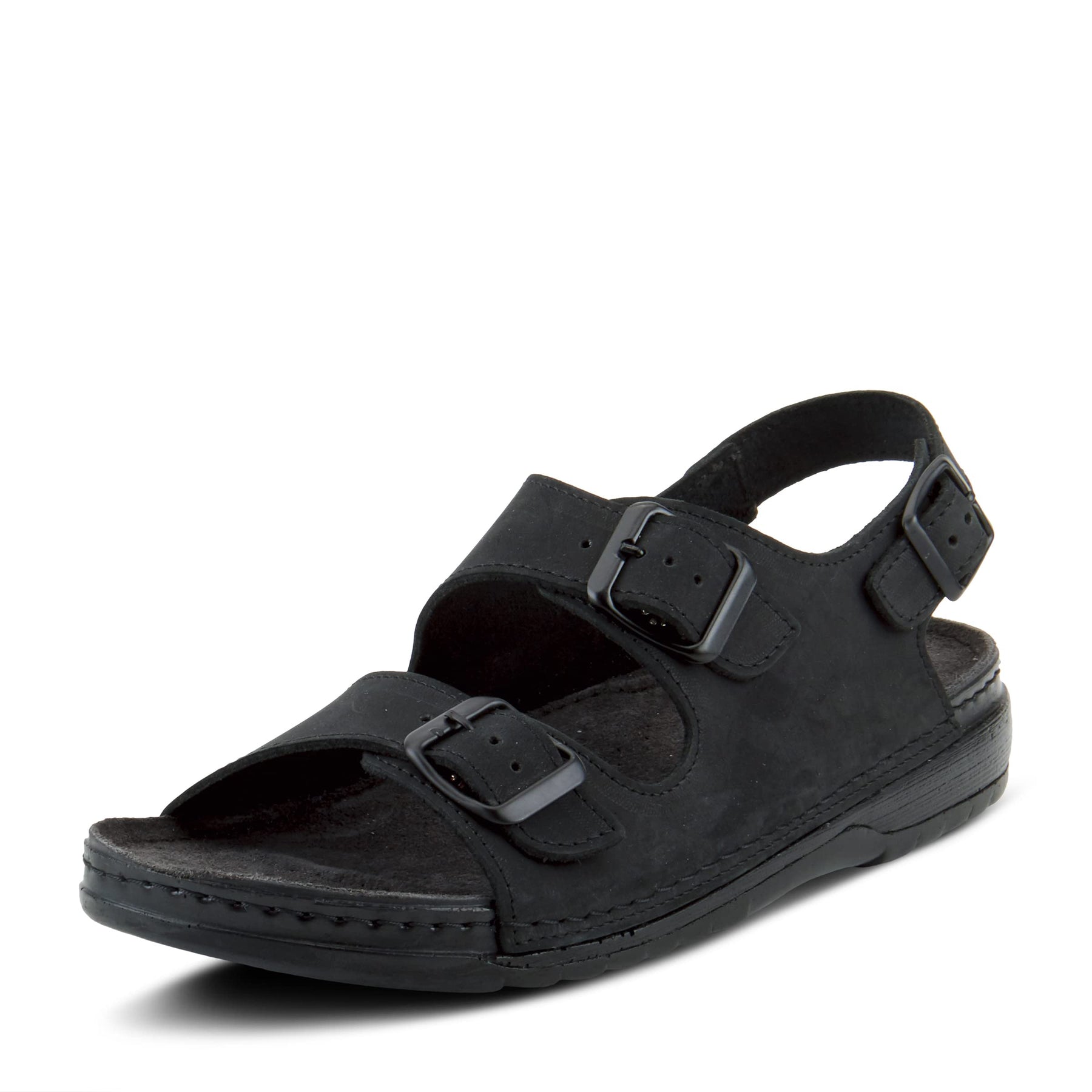 Spring Step Men's Style: SPIRO A stitch to sole construction nubuck leather back strap sandal with dual buckle straps for adjustability and fit. The leather covered padded footbed adds to the comfort of this very soft and flexible sandal.