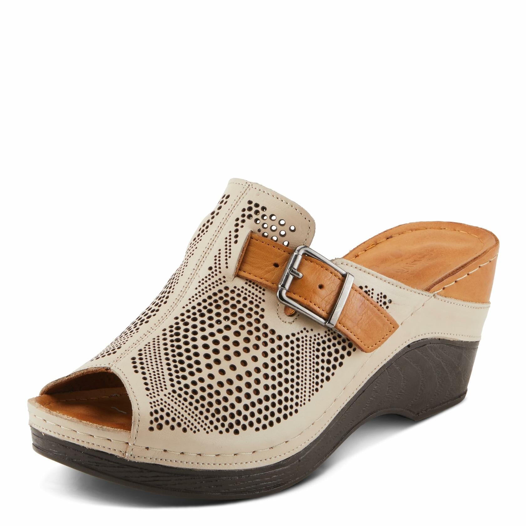 Elevate your style with our wedge slide sandal, the Spring Step MOMELLE Women's Perforated Leather Wedge Slide Sandal, featuring a chic perforated leather upper and a sophisticated buckle detail.