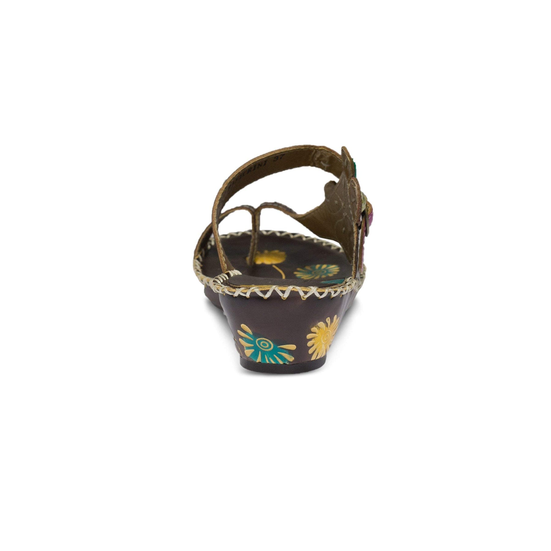 L'Artiste Style: Santorini French inspired design, hand painted leather toe-ring thong sandal featuring a jeweled tear drop stones and a floral embossed insole. Heel Height (approximately): 2 1/2", 3/4" platform. Features: -Hand painted leather, contrast stitch detailing, leather wrapped embossed insole, antiqued gold buckle. -Adjustable strap with buckle closure. -Synthetic leather lining. -Synthetic leather padded insole. -Rubber outsole. -Imported. Disclaimer: LArtiste products are made with natural tanned leather using traditional hand painting techniques. This unique finishing process is used to create a natural effect with color variations to deliver authentic look and beauty.