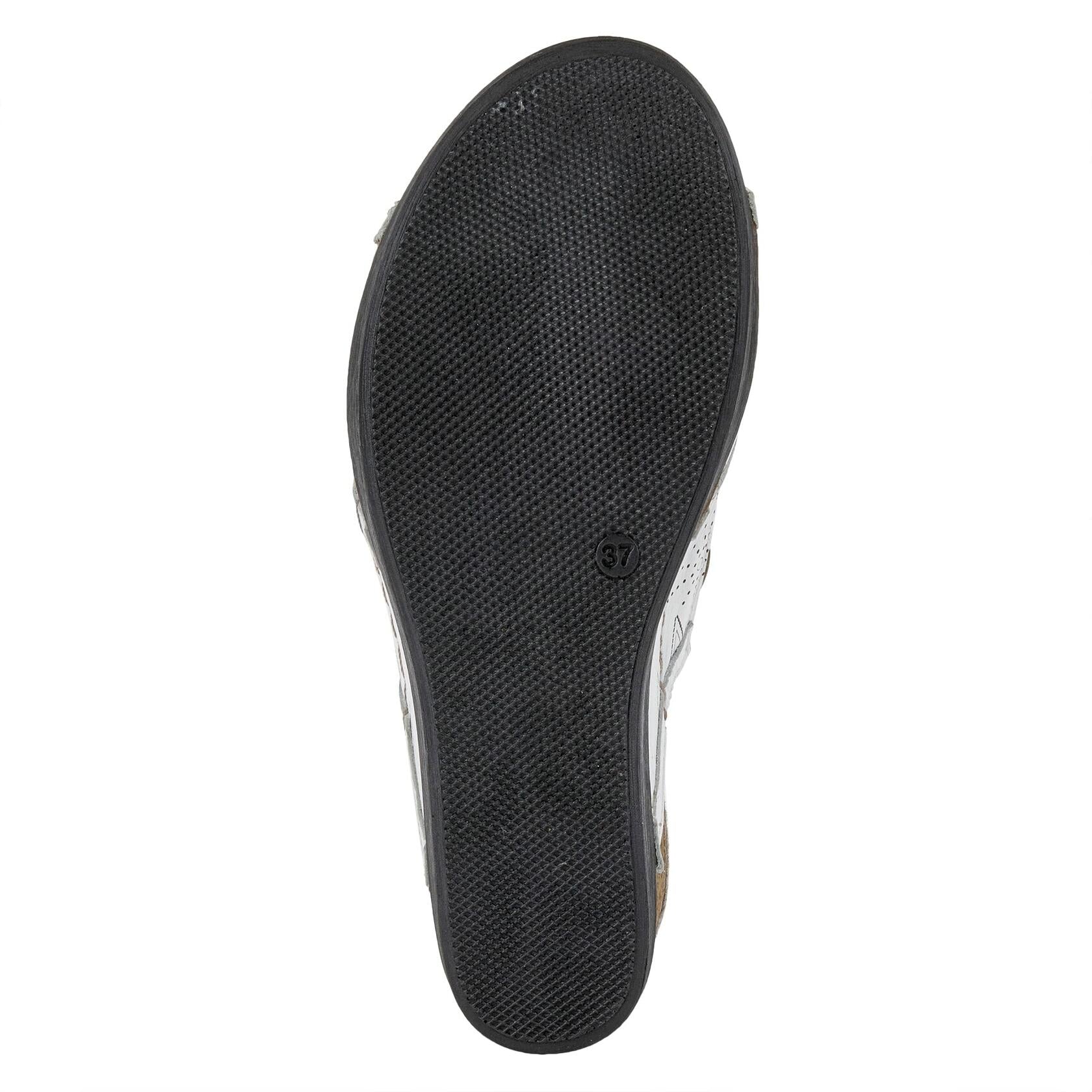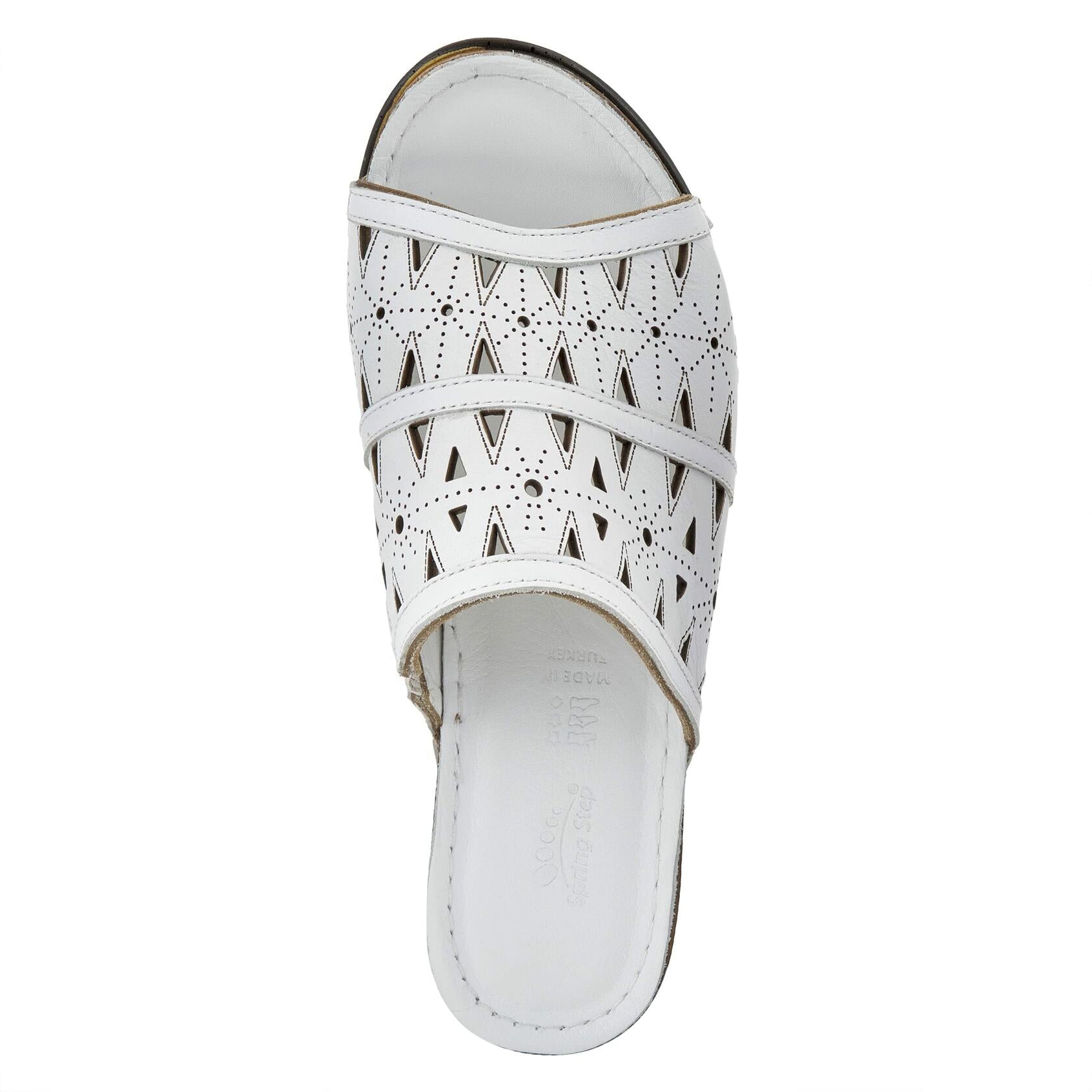 Spring Step Style: FUSAWEDGE Trendy corksole wedge, slide sandal with geometric perforations on a leather upper and molded footbed. Matching leather tonal upper and footbed. Upper: Leather Lining: Leather Insole: Leather Outsole: Polyurethane Closure: Slip-on Heel Height: 2.75" Platform Height: 1.50" Features: - Elastic, Flexible Sole, Padded Insole Made in Turkey