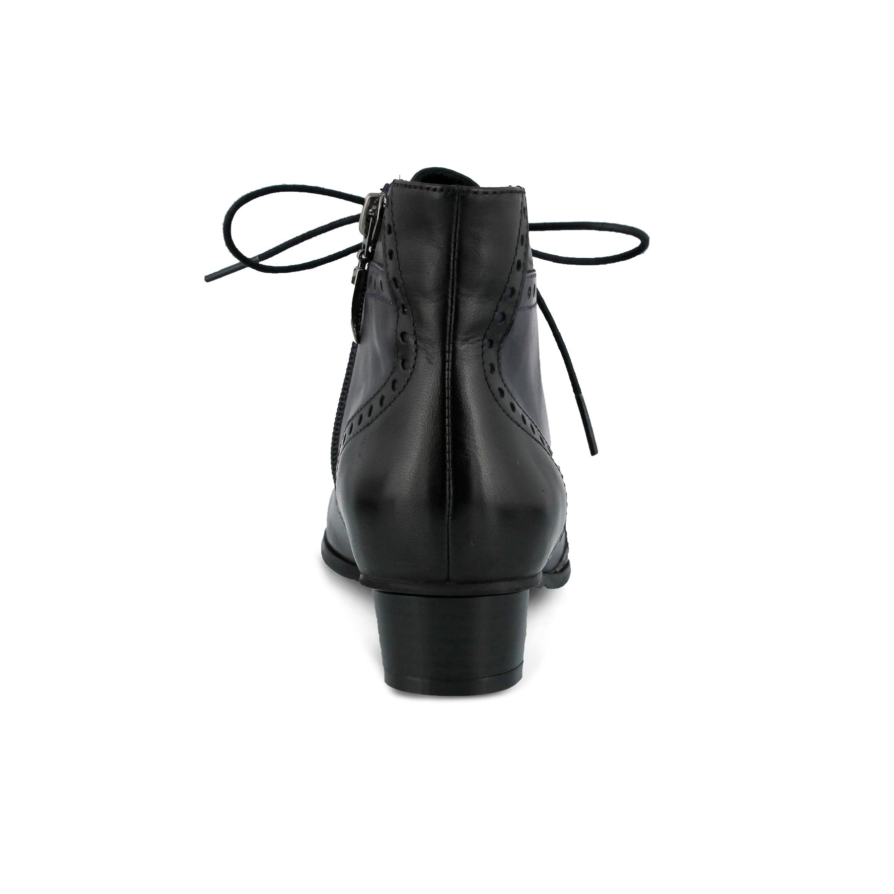 Description Polished, subtle color-blocked leather lace-up bootie with brogue details and metal eyelets.