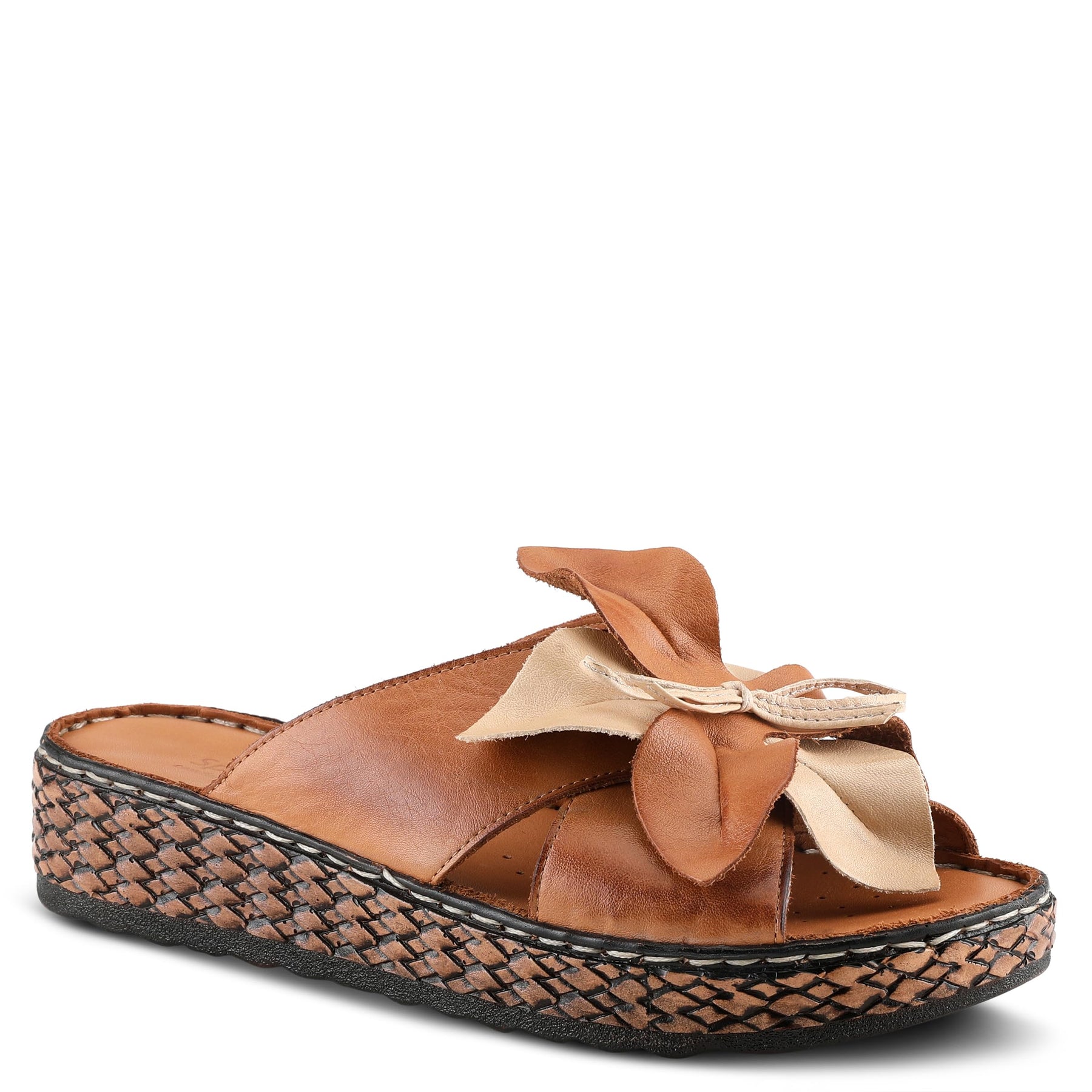 Give a dynamic statement to your feet wearing Spring Step Hilary footwear. Leather upper. Leather lining and padded footbed. Flower applique on vamp. Open toe. Flexible forefoot. Slip on closure. Applique design on midsole. Polyurethane outsole for durability.