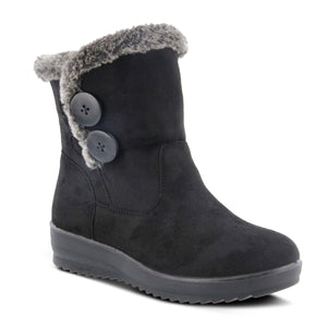Flexus Style: Istra Cozy and comfortable waterproof micro-suede booty, beautiful faux fur collar trim and two large fashionable buttons attached with bungee cord stretchable laces, very flexible construction with direct injected light weight polyurethane outsole. Heel Height (approximately): 1 1/4" Platform Height (approximately):1/2" Shaft Height (approximately): 6 1/2" Circumference (approximately): 13 1/2" Features: -Very soft waterproof micro-suede and faux fur collar, vegan-friendly materials -Round toe silhouette -Two beautiful large fashionable buttons with stretchable bungee cord -Faux fur plush cozy textile lining - Faux fur plush cozy textile covered insole -Direct injection polyurethane, slip-resistant, anti-shock and flexible outsole -Imported