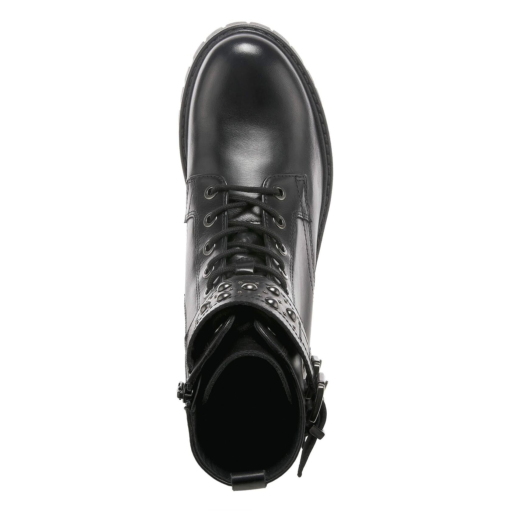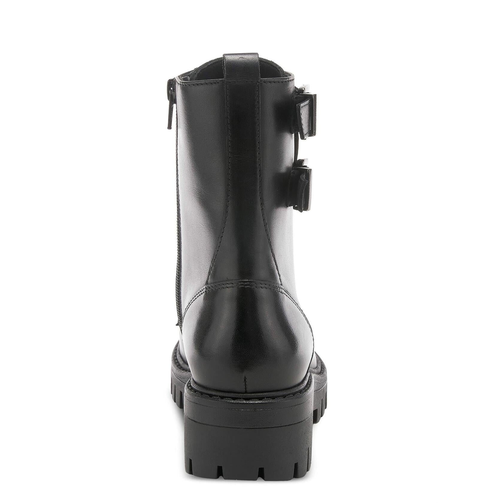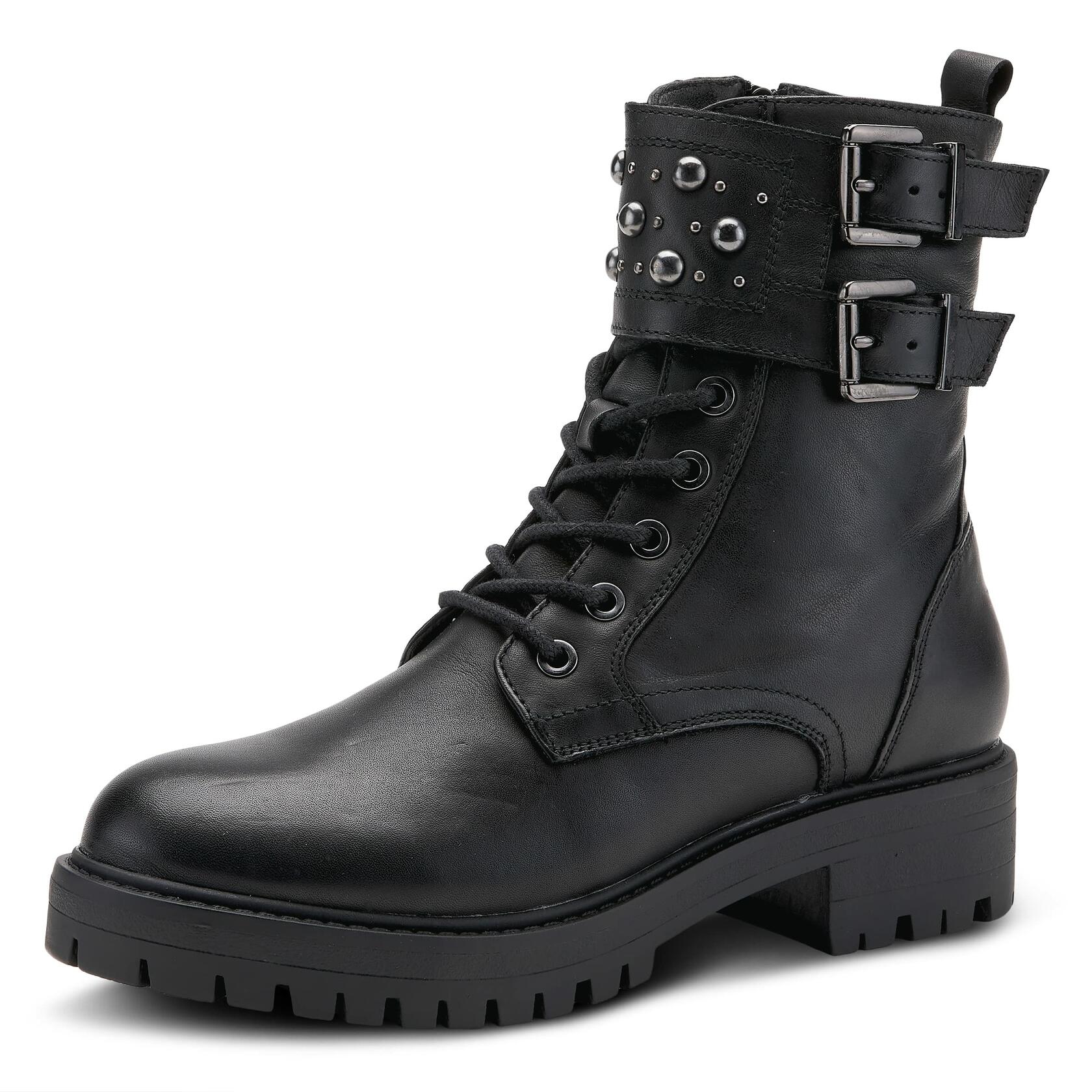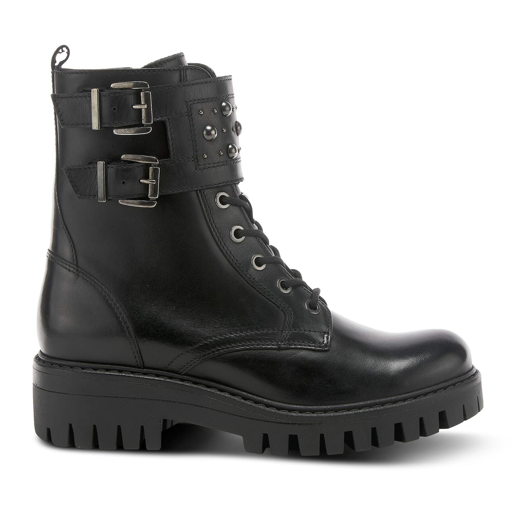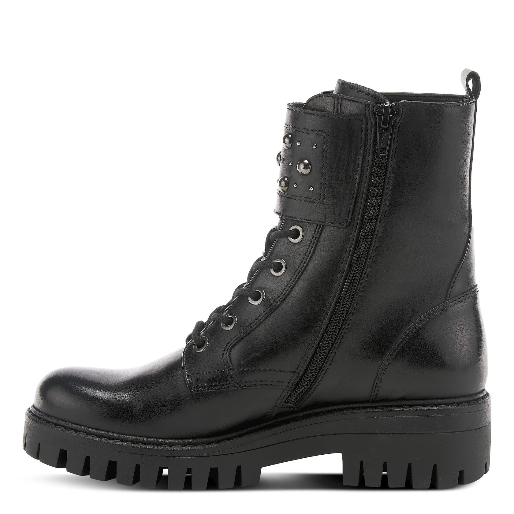 Spring Step Style: JETTA Premium leather boot starring a functional top strap with scattered studs in two sizes on a comfortable lug outsole. Upper: Leather Lining: Textile Insole: Leather Outsole: TPR Closure: Buckle, Lace-up, Zipper Heel Height: 1 5/8" Platform Height: 7/8" Shaft Height: 6 1/2" Circumference: 8 1/2"-9" Features: - Adjustable, Comfort, Padded Insole, Premium