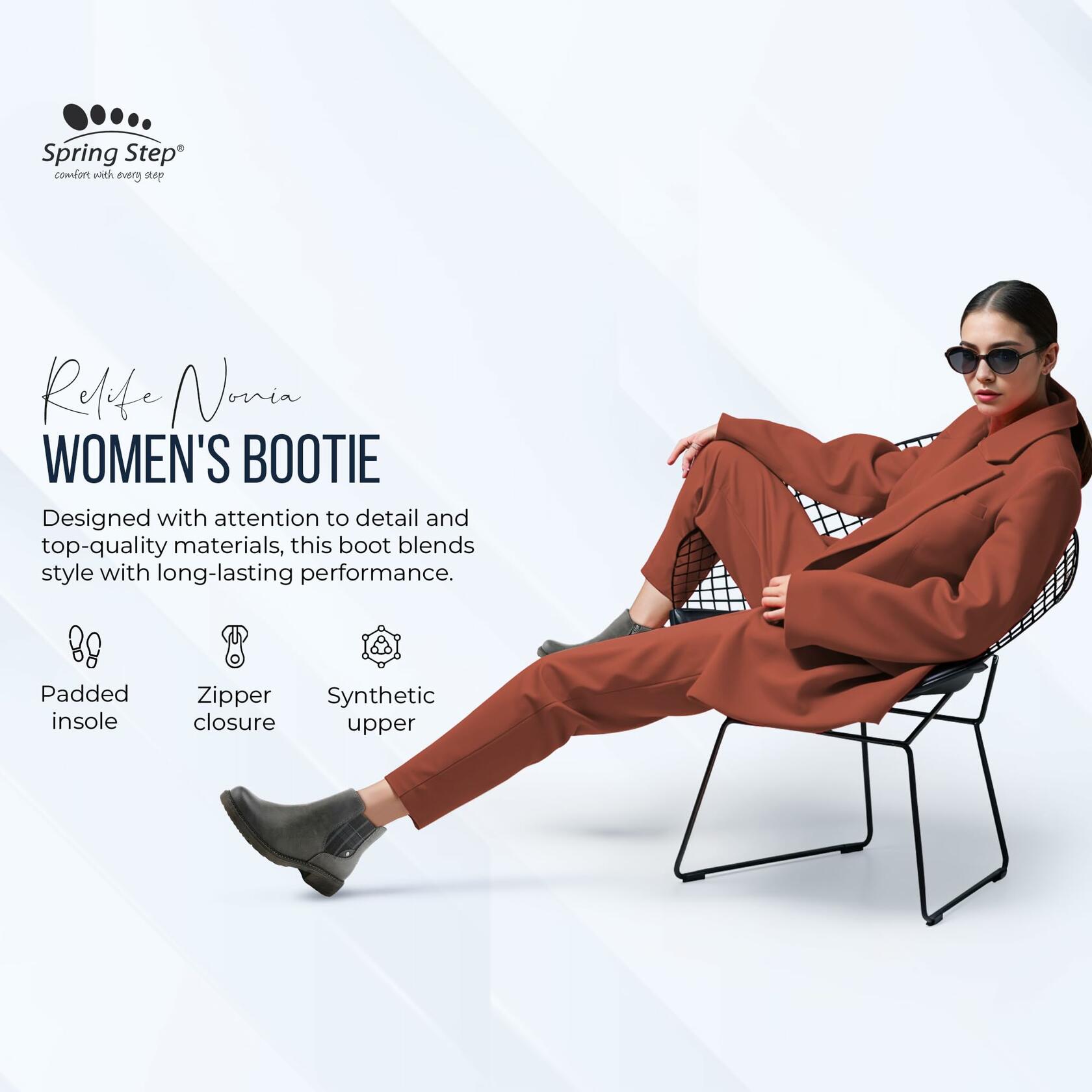 The Spring Step Relife Nonia women's booties allow you to step into a timeless style and unbeatable comfort. These women's casual shoes are a perfect blend of classic design with the modern era. Inspired by the iconic Chelsea boots, the Nonia flat booties for women feature a plaid elastic stretch function which reflects functionality with style. These flat boots for women come with some distinctive features like vegan friendly synthetic upper, textile lining and water resistance. This booty comes with a shock absorbing TPR outsole and a padded insole that secures your feet from any kind of uncomfortable circumstances. The easy to use zipper closure of these lady's ankle boots ensures a perfect fit with enhancing versatility. Whether you are heading to work or enjoying a night out, the Nonia flat boots for women provide timeless style with elegance. Features: Vegan friendly synthetic upper with water resistant properties. Shock absorbing TPR outsole for flexibility. Stylish plaid elastic stretch panels. Padded insole and textile lining. Convenient zipper closure with an ankle high shaft.