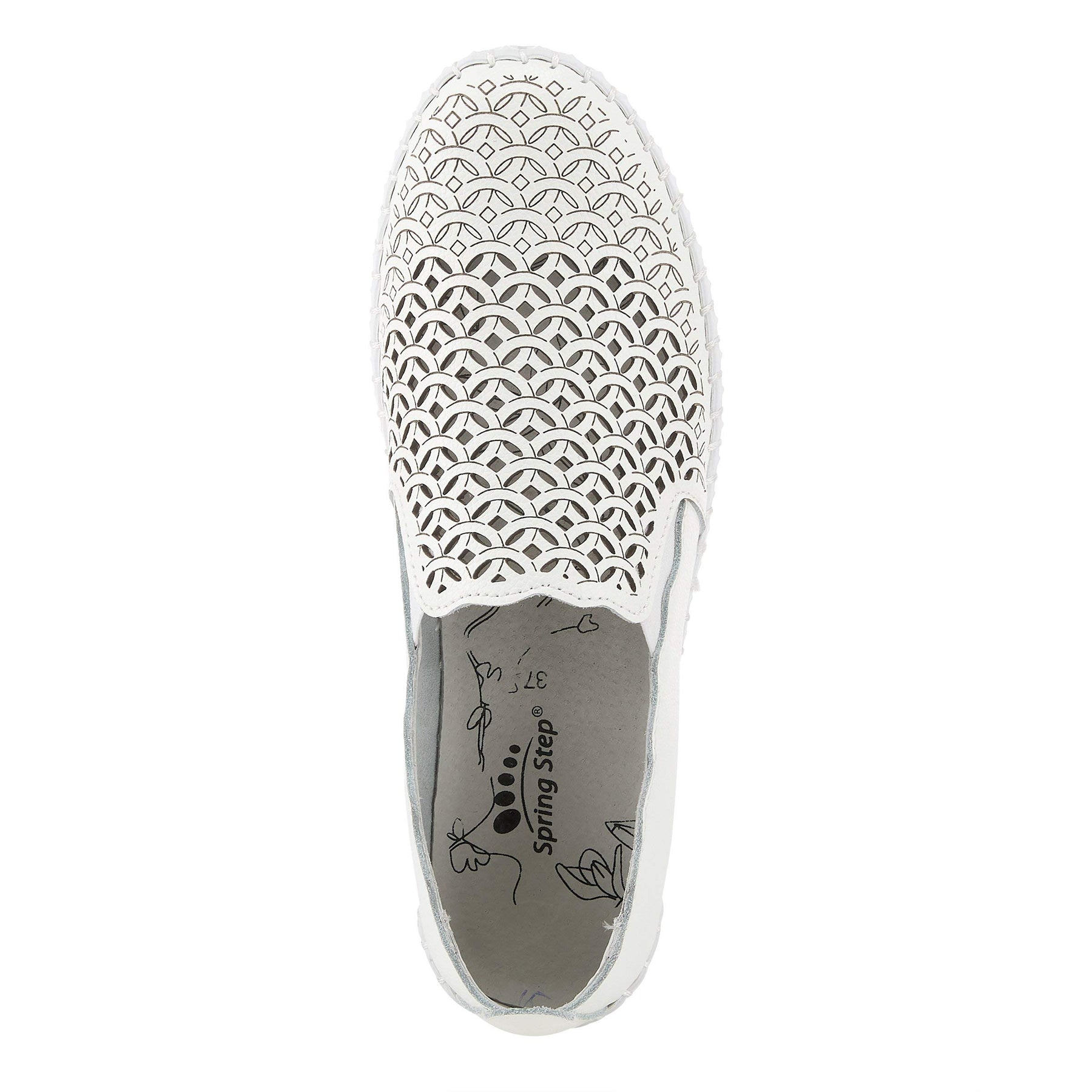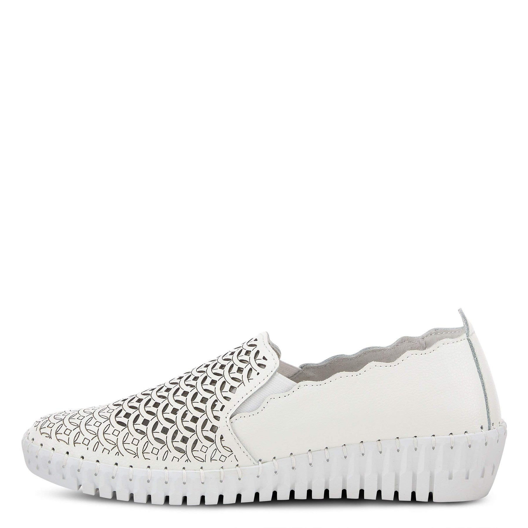 Spring Step Style: Sasze Recreational quality leather sneaker highlighting scalloped edges, perforations, and laser etching on a flexible and comfort stitched to construction sliver wedge. Heel Height: 1 7/16" Platform Height: 3/4" Features: - Heel Type: Wedge - Toe Type: Closed toe, Round toe - Features: Comfort, Elastic, Flexible Sole, Padded Insole, Removable Insole - Upper: Leather - Lining: Pigskin - Insole: Latex - Outsole: Rubber - Closure: Slip-on Disclaimer: Due to the nature of the upper material, variations in the print may occur.
