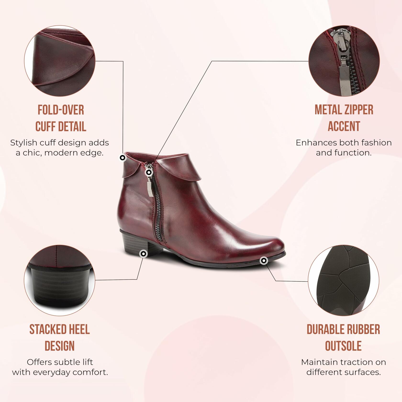 Spring Step Style: Stockholm Polished leather pull-on bootie detailed with a fold-over cuff and metal zipper. Heel Height (approximately): 1 1/4" stacked Shaft Height (approximately): 5" Circumference (approximately): 10" Features: -Round toe, polished leather, brushed pewter metal zipper, polished stacked heel. -Side zipper closure. -Soft textile lining. -Synthetic leather padded insole. -Rubber outsole. -Imported.