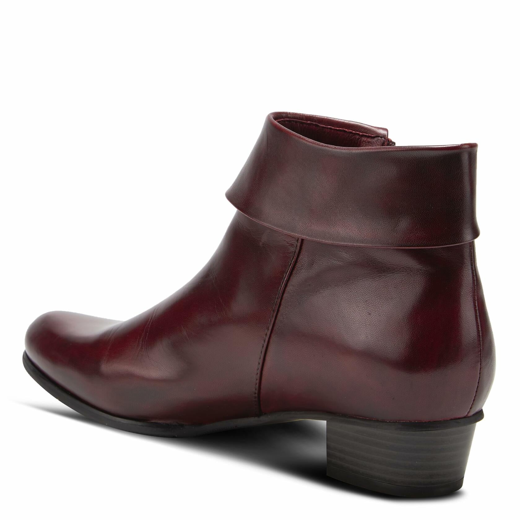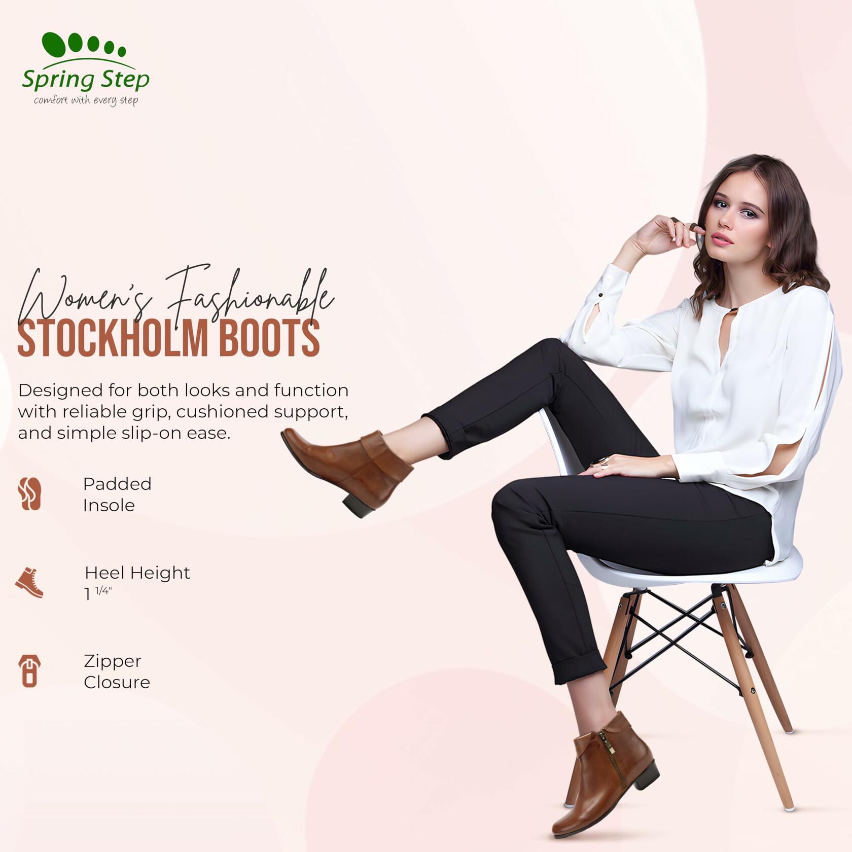 Spring Step Style: Stockholm Polished leather pull-on bootie detailed with a fold-over cuff and metal zipper. Heel Height (approximately): 1 1/4" stacked Shaft Height (approximately): 5" Circumference (approximately): 10" Features: -Round toe, polished leather, brushed pewter metal zipper, polished stacked heel. -Side zipper closure. -Soft textile lining. -Synthetic leather padded insole. -Rubber outsole. -Imported.