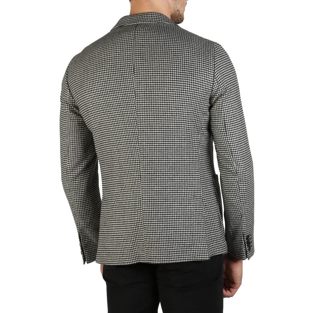 Collection:Fall/WinterGender:ManType:BlazerFastening:buttonsSleeves:longExternal pockets:3Internal pockets:2Material:elastane 2%wool 62%polyamide 4%polyester 32%Pattern:pied-de-pouleModel height, cm:188Model wears a size:50Inside:unlinedDetails:visible logo