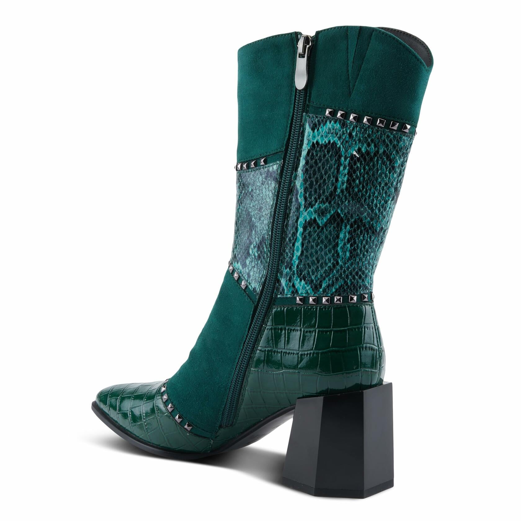 Fierce Style with Azura ZAYRINA Boots - These boots feature a combination of textures and prints for a powerful look. Perfect for making a statement. Key Features: Upper: Leather Combo, Lining: Faux Fur, Insole: Faux Fur, Outsole: Rubber, Closure: Zipper, Heel Height: 2 3/4", Shaft Height: 11 3/4", Circumference: 11 1/2". Mix of materials and animal prints, stud details, and an extended chunky heel.