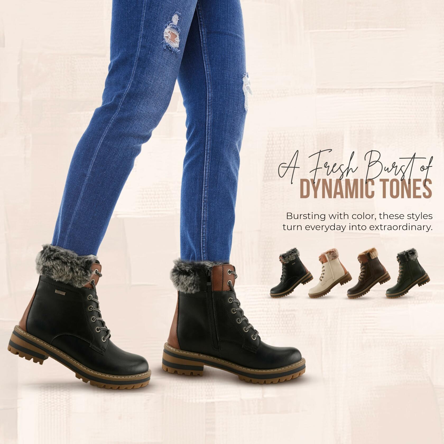 The Patrizia Canario womens winter boot offers a perfect blend of style, warmth, and practicality for colder months. The water-resistant faux leather upper protects feet from light rain and snow, ensuring dryness and durability. This boots two-tone design is accented with plush faux fur lining, which keeps feet cozy while adding a fashionable touch. The lace-up closure combined with an inside zipper provides an adjustable and secure fit with effortless on/off convenience. The durable lug sole offers reliable traction on slick or uneven surfaces, making walking safer during winter. The 1 3/4"" block heel delivers subtle height without sacrificing comfort or stability, ideal for all-day wear. This boots cushioned textile insole and sherpa lining enhance overall comfort, making it suitable for both urban outings and weekend getaways. The 6 1/2"" shaft height and 8"-9" circumference ensure a snug yet comfortable fit. The Patrizia Canario boot is a versatile choice for fashion-conscious women seeking warmth, functionality, and elegant design during cold weather. Features: Water-resistant faux leather upper Plush warm plush lining inside Convenient lace-up and zipper Durable lug sole for traction Comfortable cushioned insole Sturdy 1 3/4 inch block heel Easy slip-on and off design Stylish two-tone winter boot Perfect for cold-weather wear Enhanced grip on slippery ground