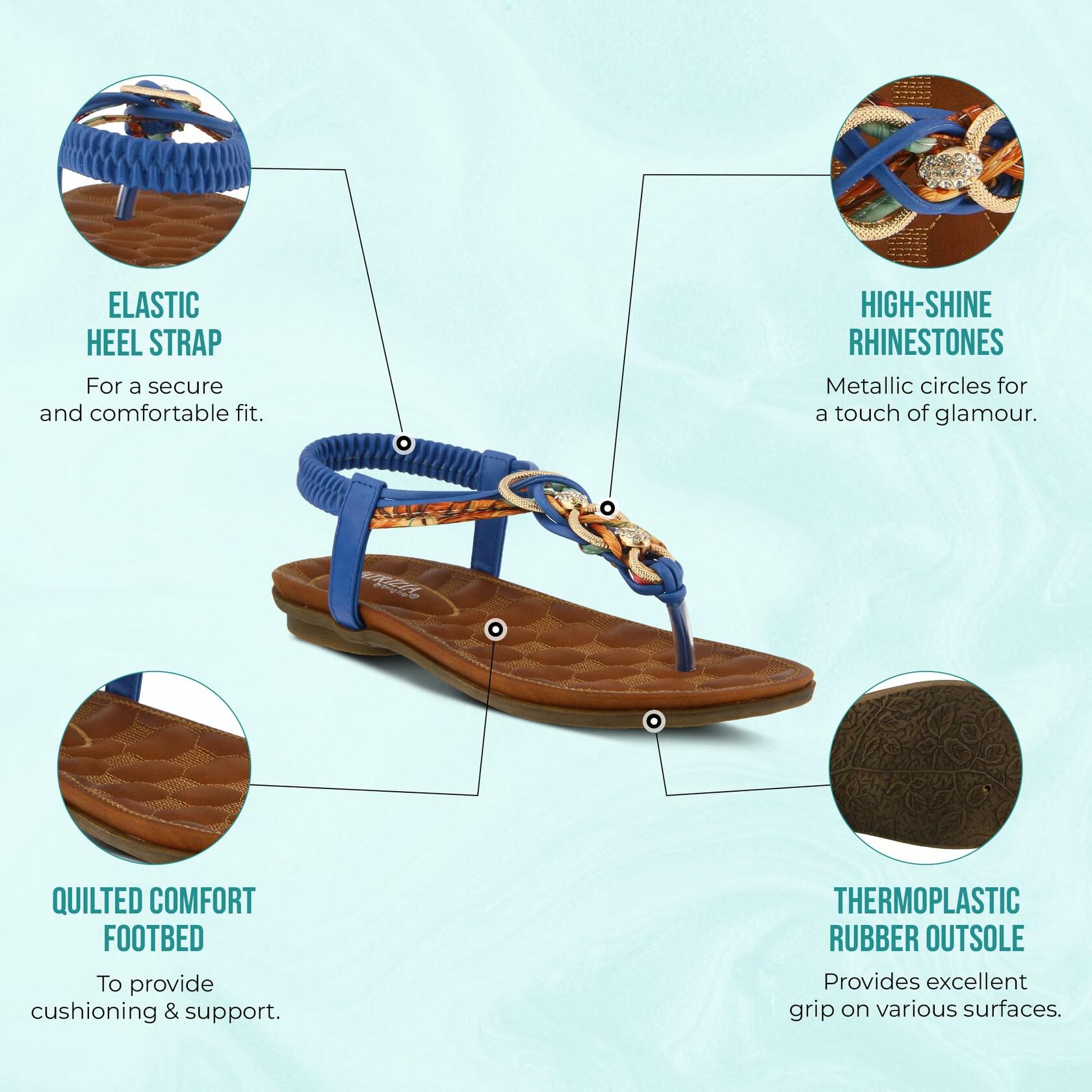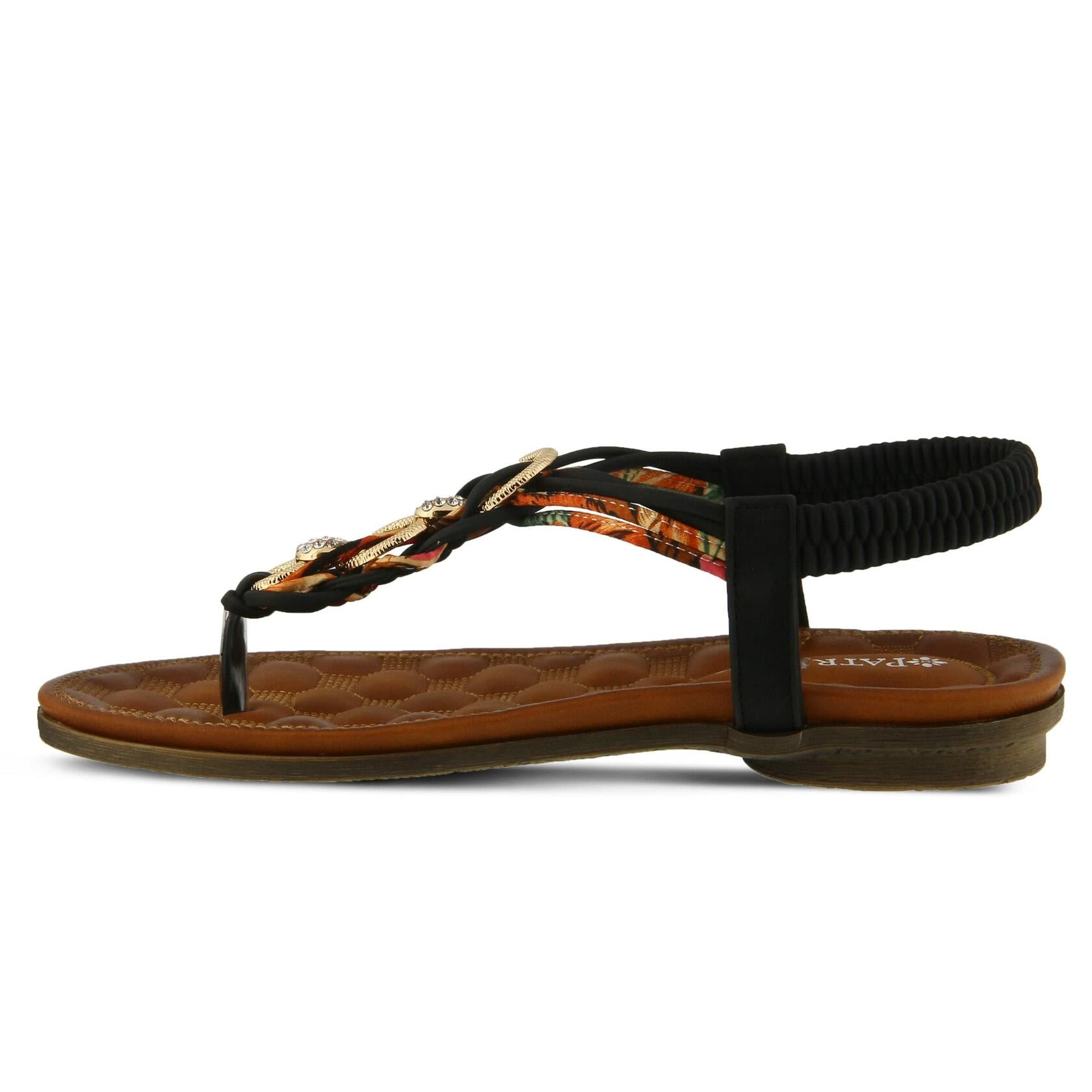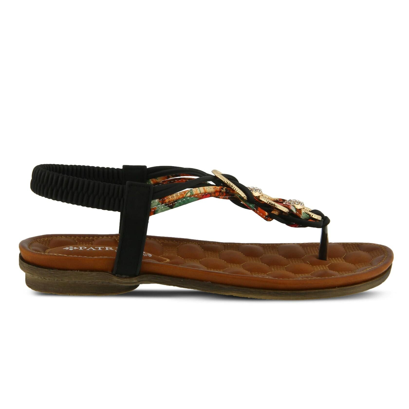 Patrizia Style: Gadelina Embellished t-strap sandal featuring a metal and high-shine faceted rhinestone ornament and a covered elastic heel strap. Heel Height (approximately): 1" Features: -Manmade upper, high-shine rhinestones, quilted comfort foot bed. -Synthetic leather lining. -Synthetic leather padded insole. -TPR outsole. -Imported.
