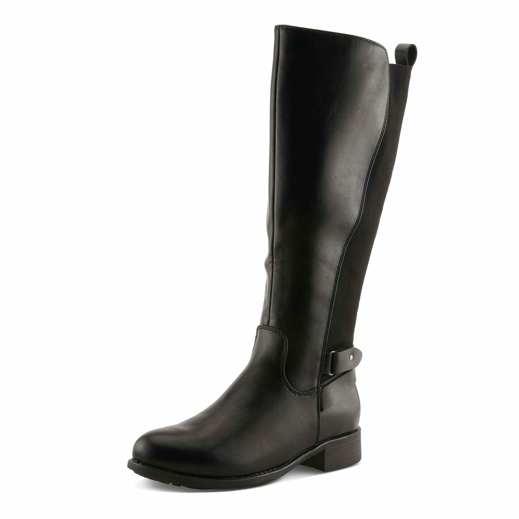 Polished and timeless, the Patrizia PAPINA riding boot blends equestrian-inspired charm with modern-day comfort. Crafted from sleek faux leather with a flexible stretch knit back panel, this knee-high silhouette molds to your leg for a custom fit. A decorative buckle adds refined detail, while the faux fur lining keeps you cozy. The low stacked heel provides everyday stability, making PAPINA the perfect match for dresses, denim, and everything in between.
