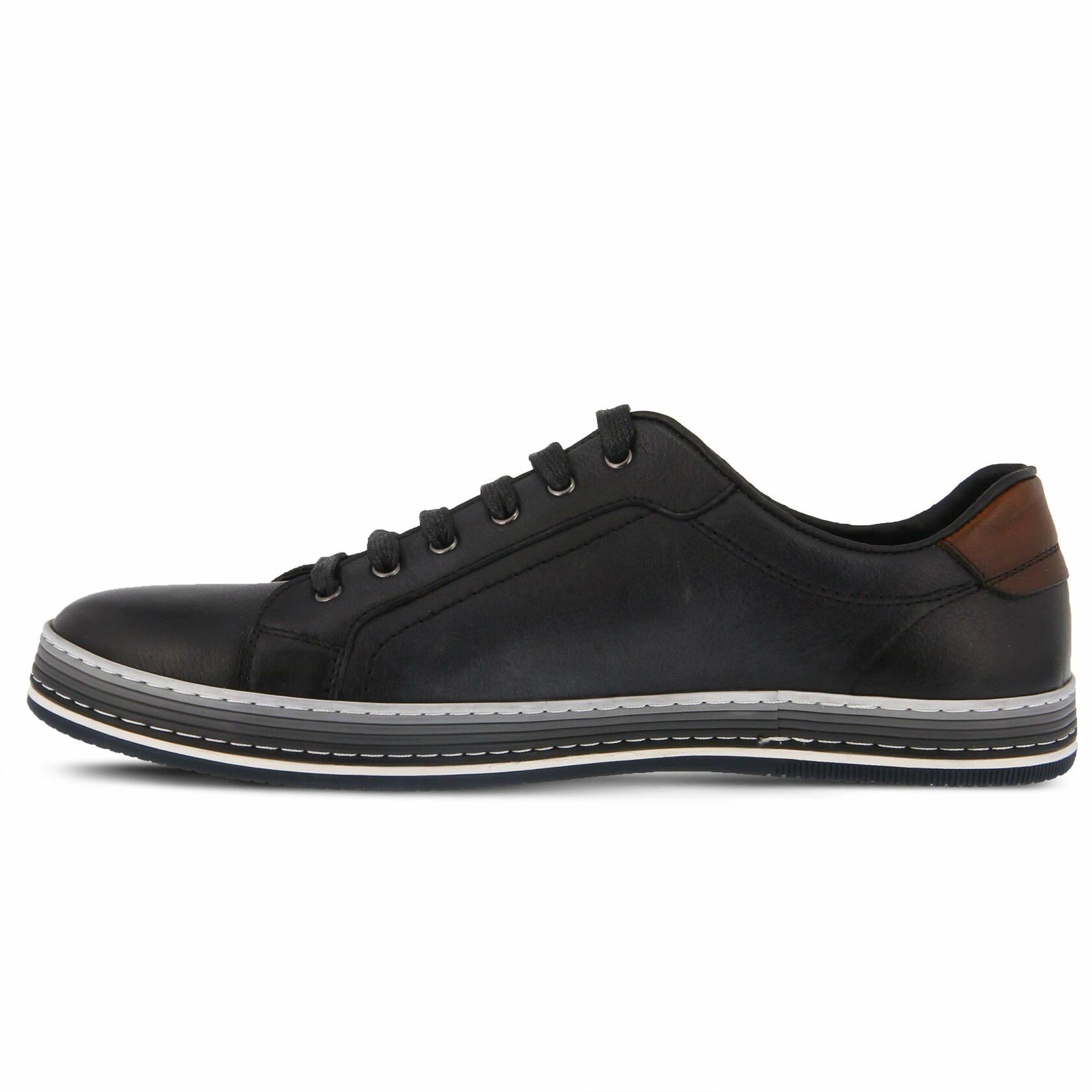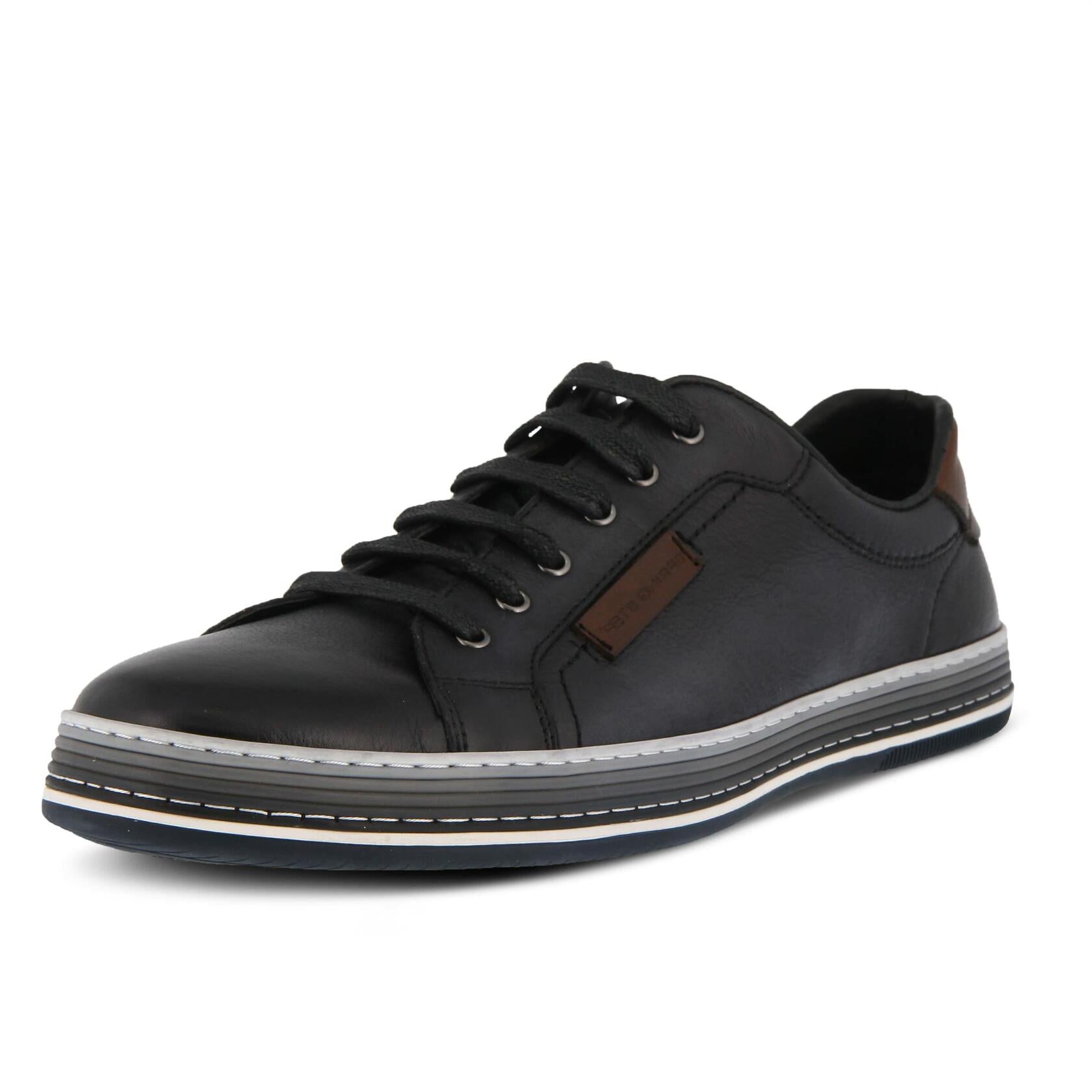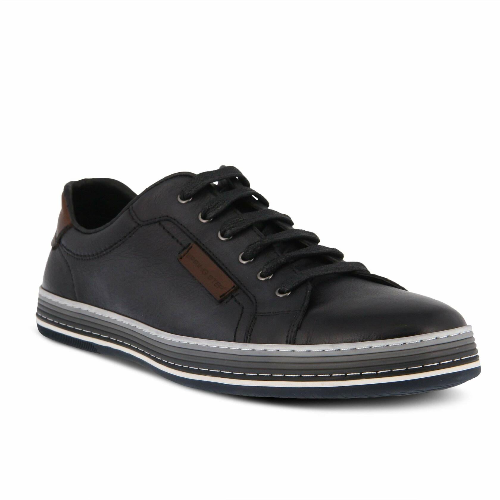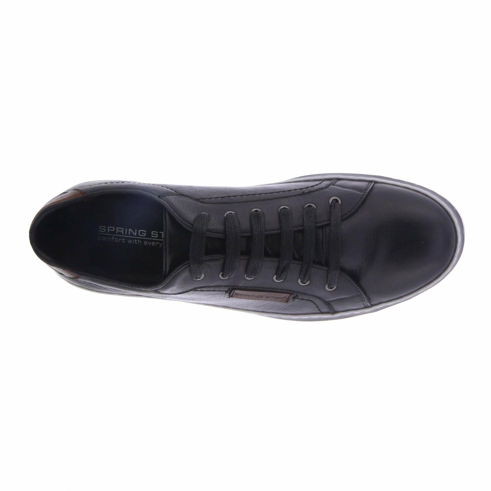 Spring Step Men's Style: Tommie Menƒ‚¬s long facing six (6) eyelet derby shoe in full grain soft burnished and polished leather featuring a comfortable padded sports style top-line with contrast leather logo and heel trim, all on a three-color side wall stitched rubber out-sole. Heel Height (approximately): 3/8" flat Platform Height (approximately): flat Features: -Full grain soft burnished and polished leather. -Round sporty toe. -long facing with six (6) metal eyelets and a durable flat wax cotton lace. -Imitation leather and textile lining. -Imitation leather comfort padded, removable insole. - Side wall stitched three-color flexible rubber out-sole. -Imported.